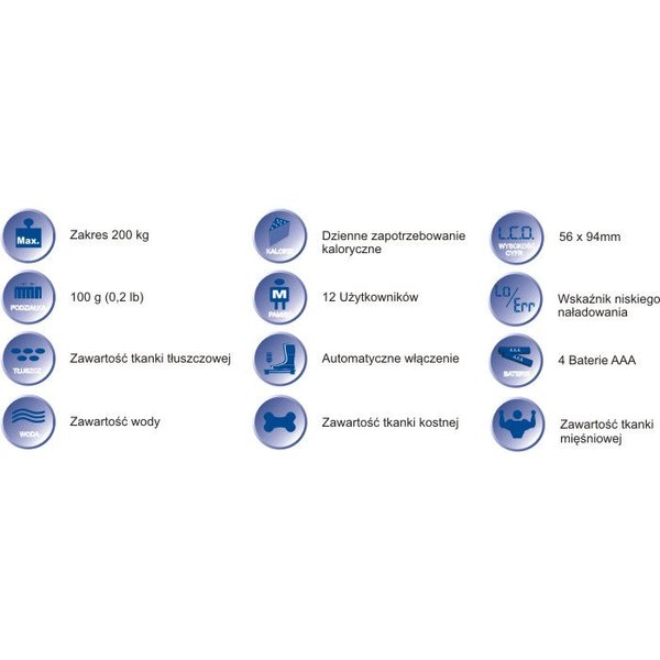 - zakres pomiaru tkanki tłuszczowej: 4-60%