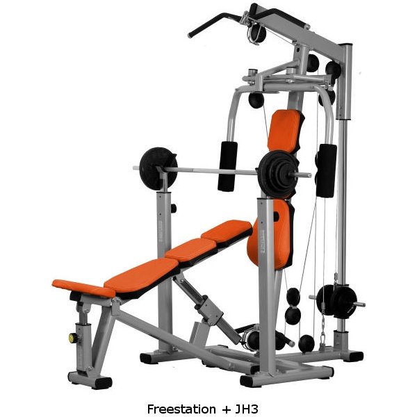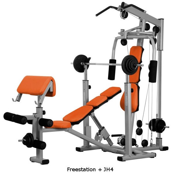 Stanowisko do ćwiczeń z wolnymi ciężarami. Wszystkie elementy ruchome są łożyskowane (łożyska kulkowe). (Zestaw bez sztang, ławki i obciążników)