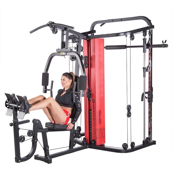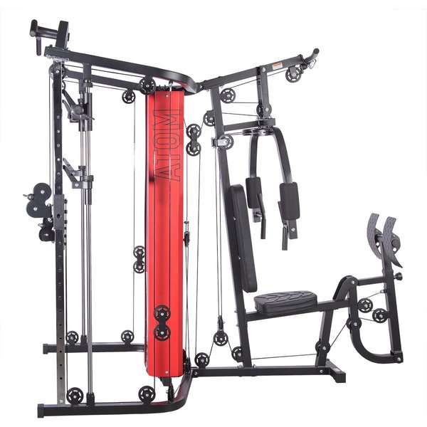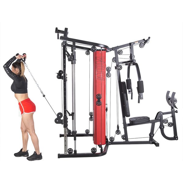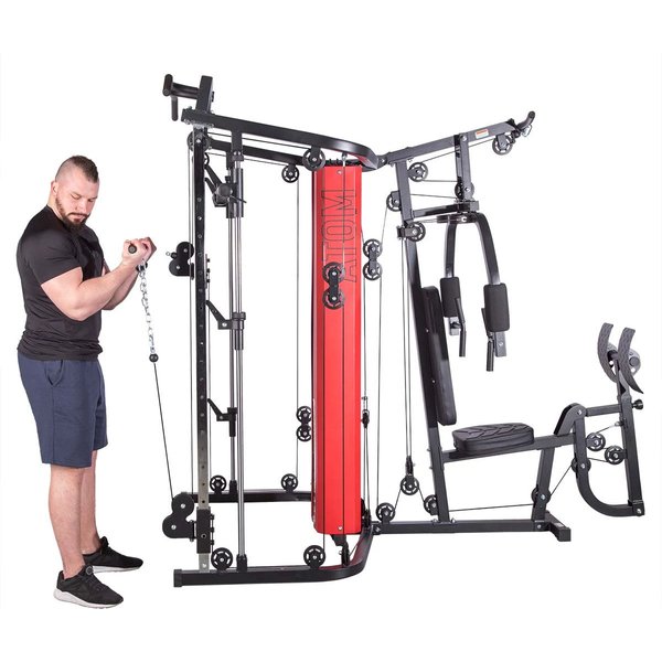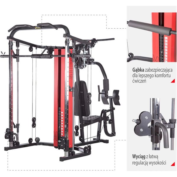 Atom HMS to nie tylko wytrzymałe urządzenie, ale także kompleksowy zestaw do ćwiczeń. Znajdziemy tutaj suwnicę smitha, dwa wyciągi z regulowaną wysokością, ramie wyciskowe, które można przekształcić w butterflya, miejsce do wyciskania nogami oraz drążek do podciągania. Dzięki temu, mamy możliwość wykonania różnorodnych ćwiczeń na każdą partię mięśniową.