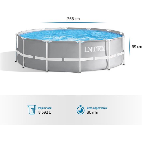 Basen stelażowy Prism Frame 366x99cm marki Intex zapewni Ci przyjemne ochłodzenie w czasie letnich upałów.