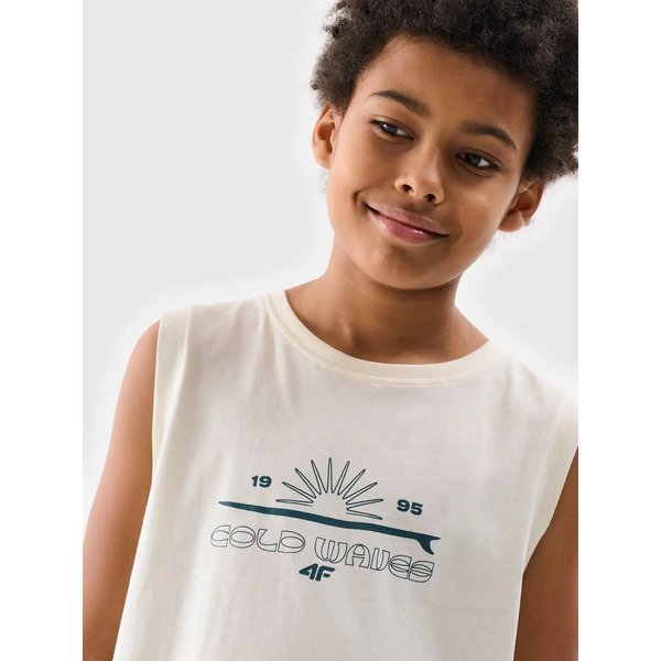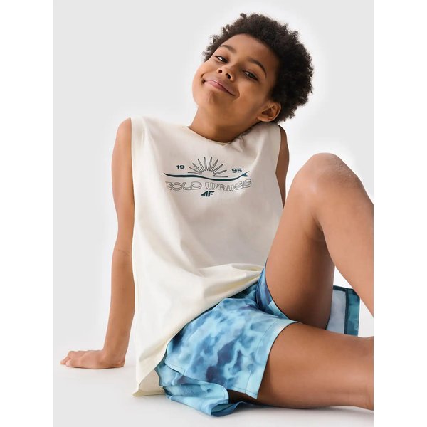 Chłopięcy bezrękawnik od 4F to idealna propozycja dla młodych miłośników wygody i stylu. Wykonany w 100% z naturalnej bawełny, zapewnia doskonałą oddychalność oraz komfort noszenia przez cały dzień. Dzianina single jersey jest miękka i przyjemna w dotyku, co sprawia, że koszulka jest idealna na letnie dni. Luźny krój daje swobodę ruchów, a okrągły dekolt dodaje klasycznego wyglądu. Nadruk z grafiką nadaje unikalnego charakteru, przyciągając wzrok i podkreślając młodzieżową energię. To doskonały wybór do aktywnego spędzania czasu na świeżym powietrzu.