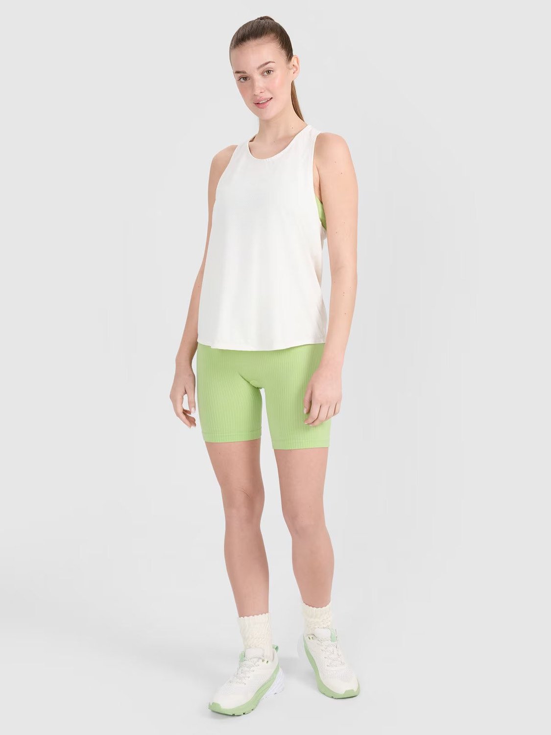 Bezrękawnik damski 4F to idealny wybór dla aktywnych kobiet ceniących komfort i styl. Luźny krój zapewnia swobodę ruchów, a przedłużony tył i wycięcia na plecach dodają nowoczesnego wyglądu. Dzięki zastosowaniu technologii 4F Dry, materiał skutecznie odprowadza wilgoć, co gwarantuje uczucie świeżości podczas intensywnego treningu. Szybkoschnące właściwości tkaniny sprawiają, że bezrękawnik jest gotowy do ponownego użycia w krótkim czasie. Okrągły dekolt i logo nadają całości sportowego charakteru, a teksturowany materiał podkreśla unikalność produktu. Idealny do sportu i rekreacji, łącząc funkcjonalność z modnym designem.