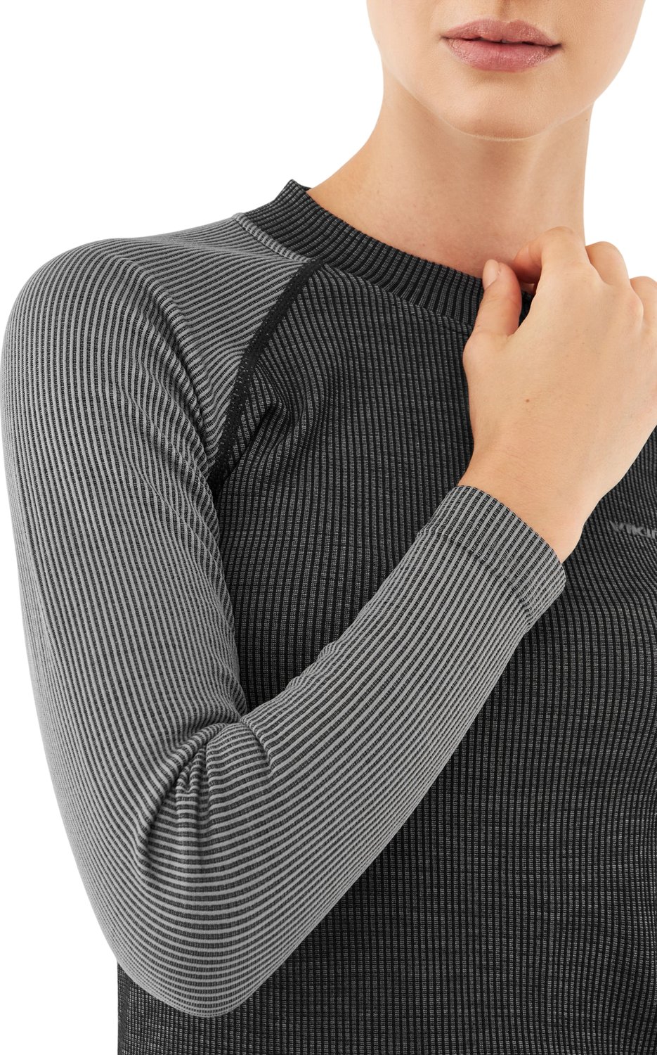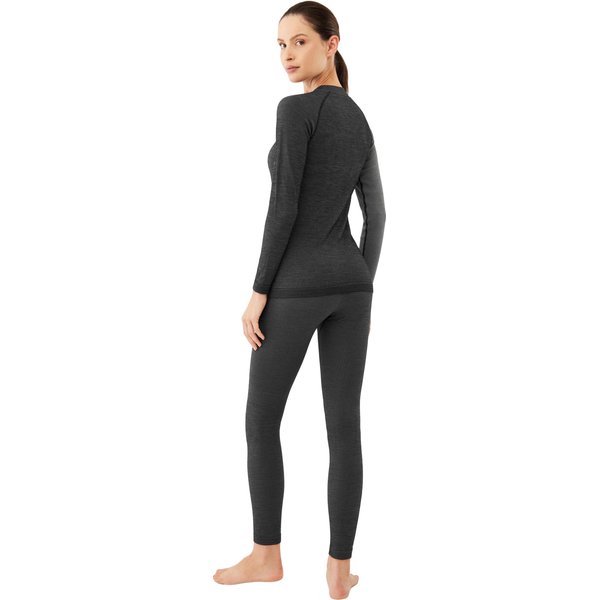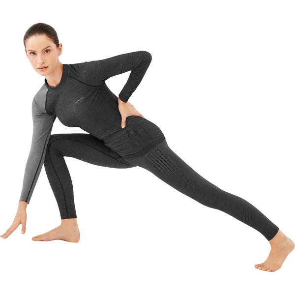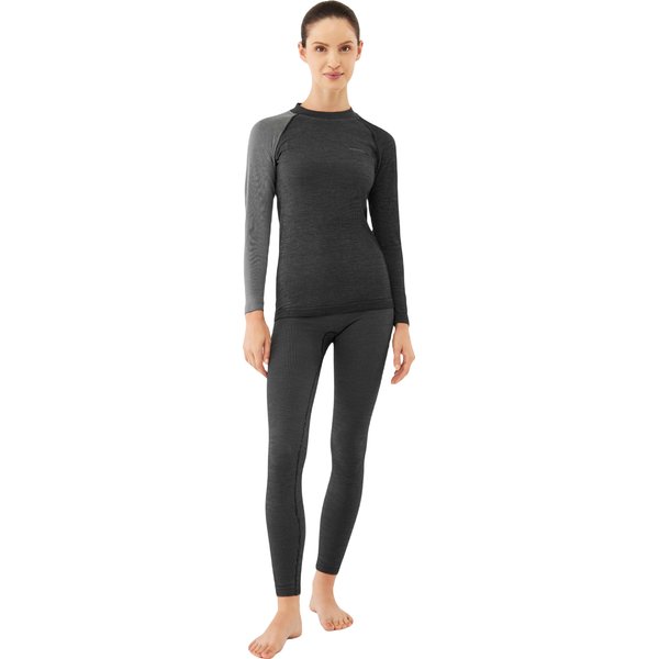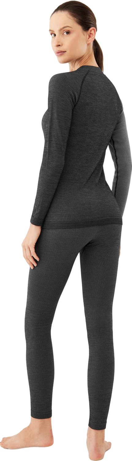 To dwuczęściowy zestaw, który składa się z bluzki z długim rękawem o okrągłym dekolcie oraz dopasowanych, długich spodni z elastyczną talią. Bielizna ta została zaprojektowana z myślą o maksymalizacji komfortu podczas każdej aktywności fizycznej, niezależnie od warunków atmosferycznych. Podstawową zaletą tego produktu jest jego wysoka elastyczność, która pozwala na pełną swobodę ruchów. Dzięki temu użytkowniczka może cieszyć się niezrównanym komfortem, nawet podczas najbardziej intensywnych ćwiczeń. Elastyczność materiału idzie w parze z doskonałym dopasowaniem, które podkreślają raglanowe rękawy oraz prążkowany wzór materiału, nadając całości nowoczesny i stylowy wygląd.