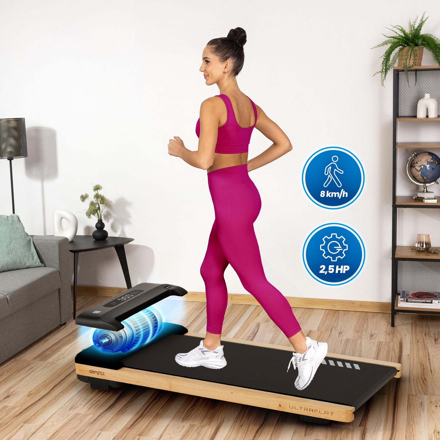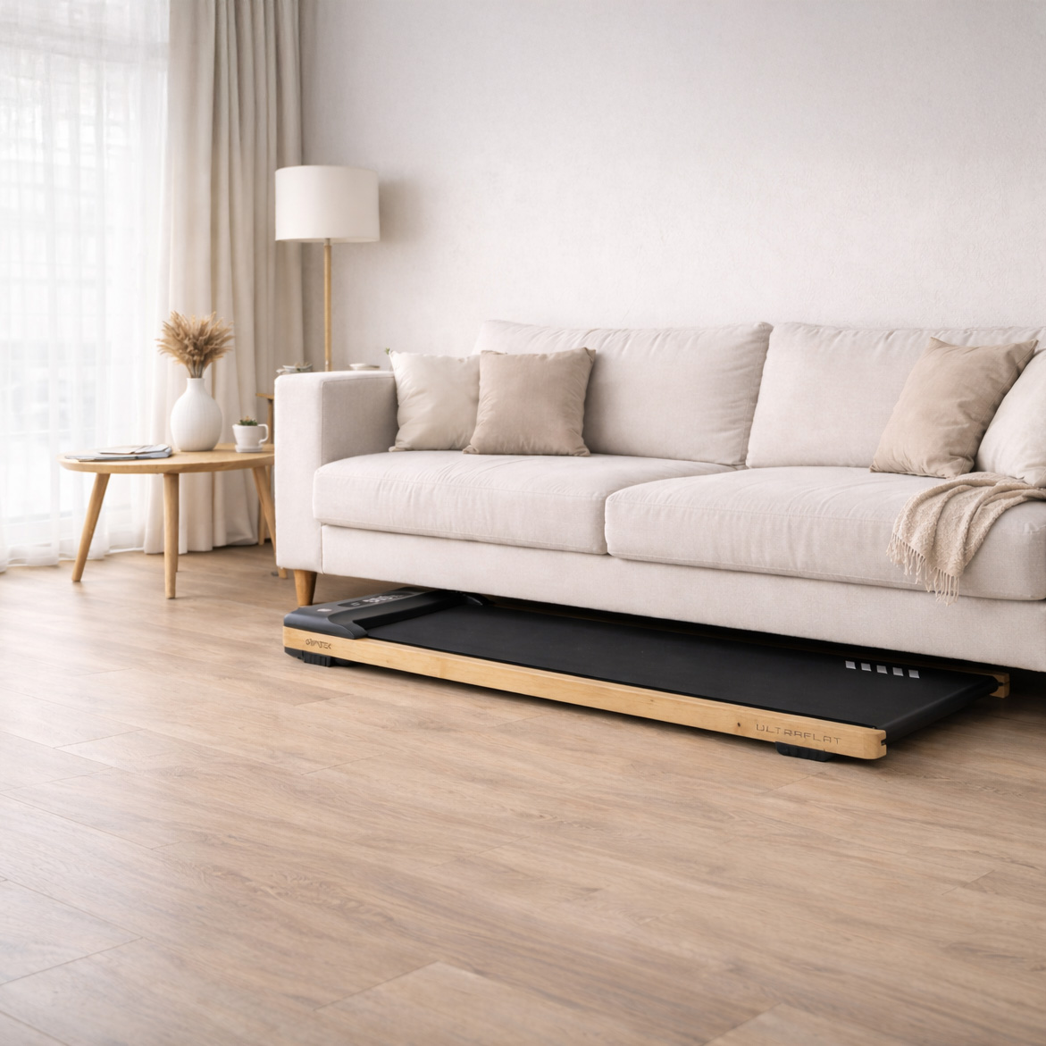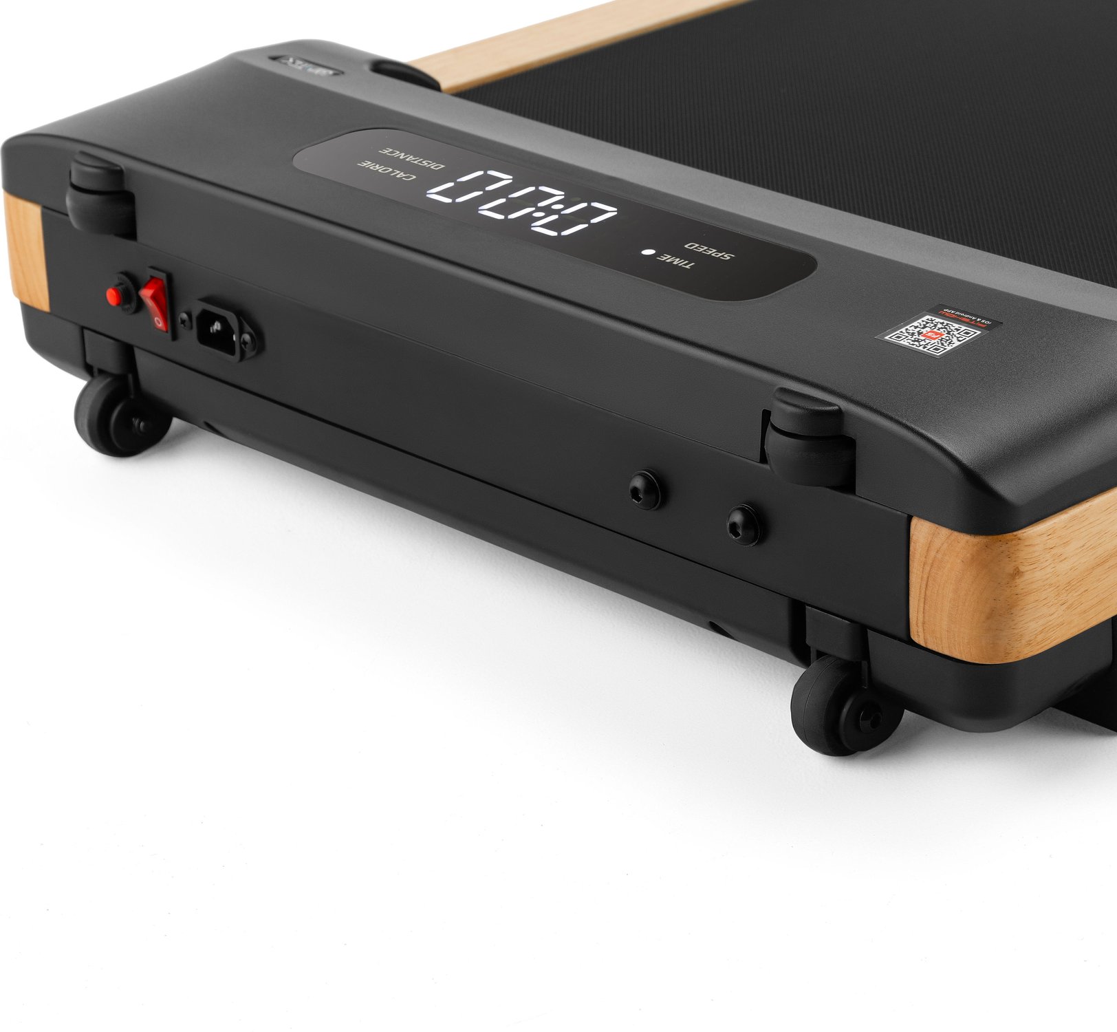 - Kompaktowa konstrukcja: Smukła forma bez poręczy pozwala łatwo wsunąć bieżnię pod biurko lub łóżko, zapewniając oszczędność miejsca i estetyczny wygląd.