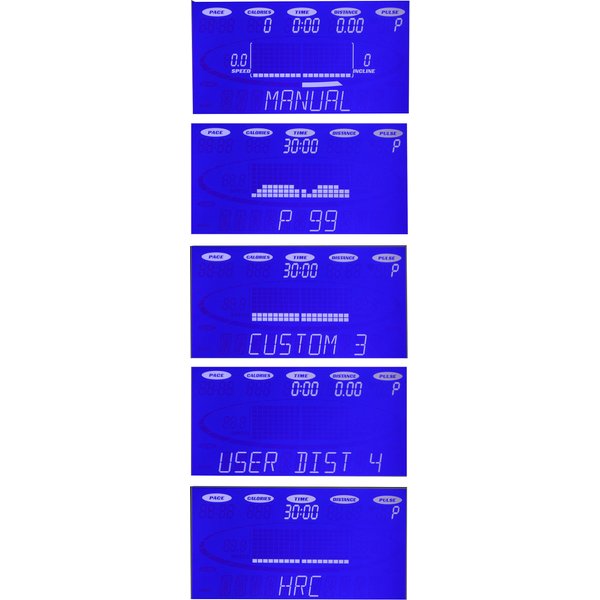 - przyciski skrótu do prędkości: 3,6,9,12 km/h oraz kąta nachylenia: 3,6,9,12, 15