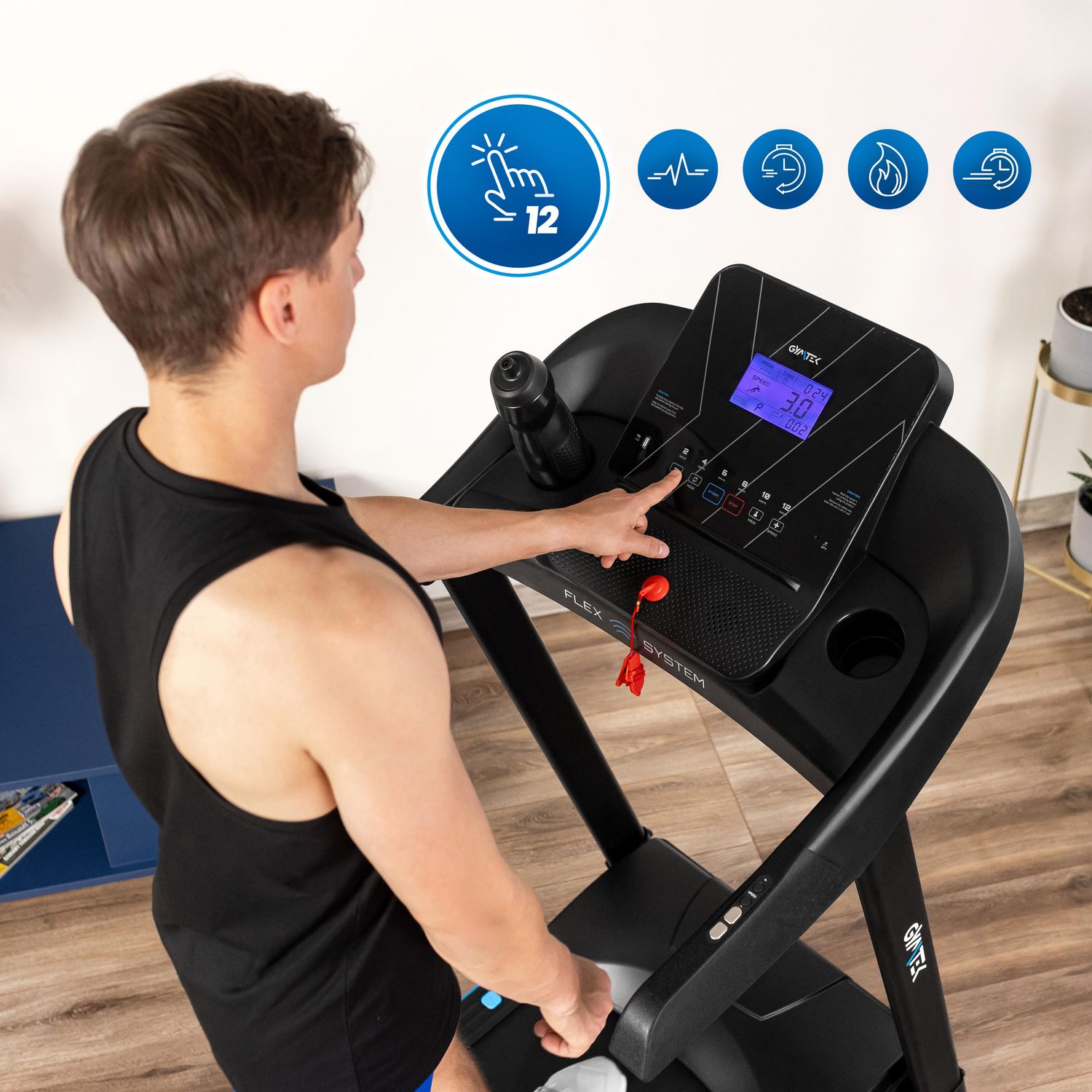 Flex Speed umożliwia dynamiczną regulację prędkości, pozwalając na błyskawiczną zmianę tempa co 2 km/h w zakresie od 2 do 16 km/h za pomocą jednego przycisku. To rozwiązanie zapewnia płynne dostosowanie intensywności biegu, dzięki czemu użytkownik może swobodnie kontrolować tempo i dostosowywać je do swoich potrzeb w trakcie treningu.