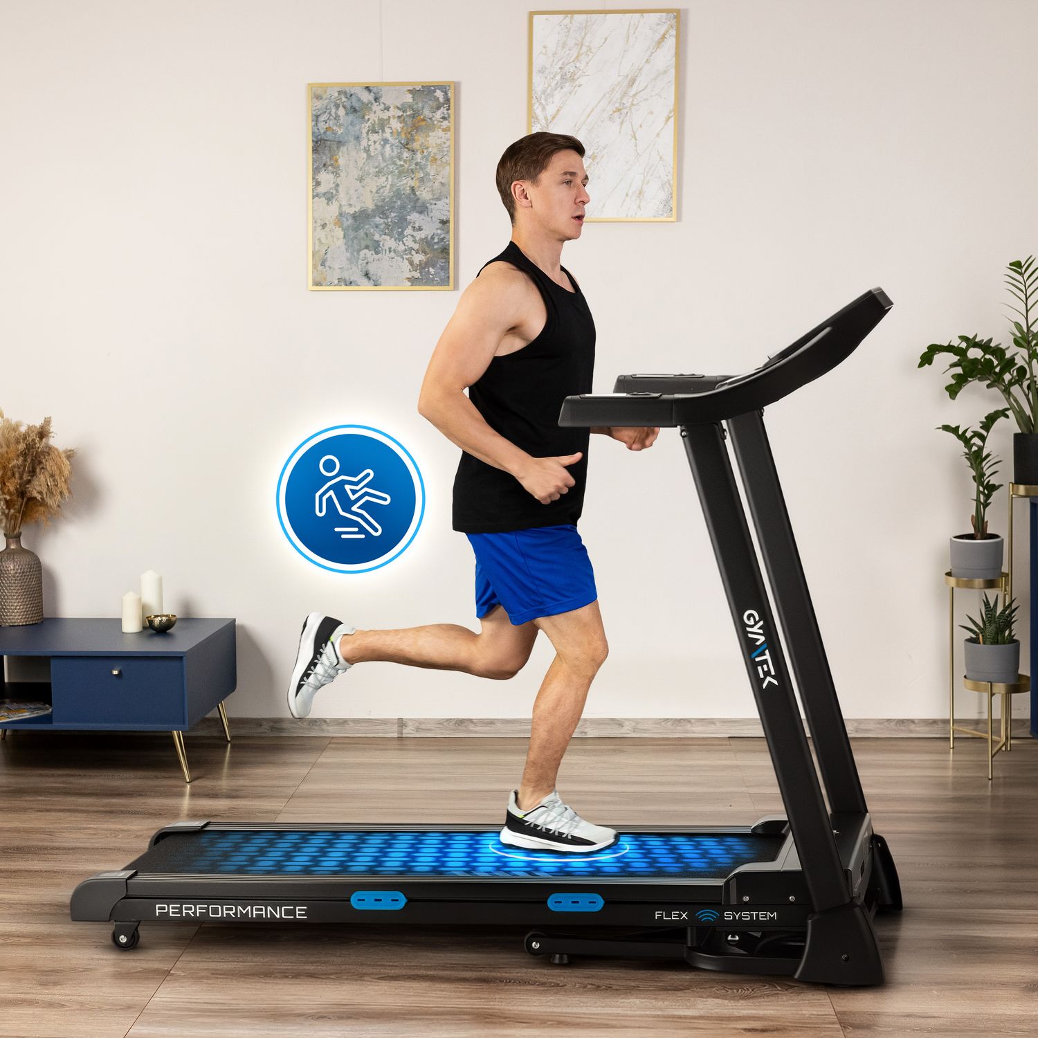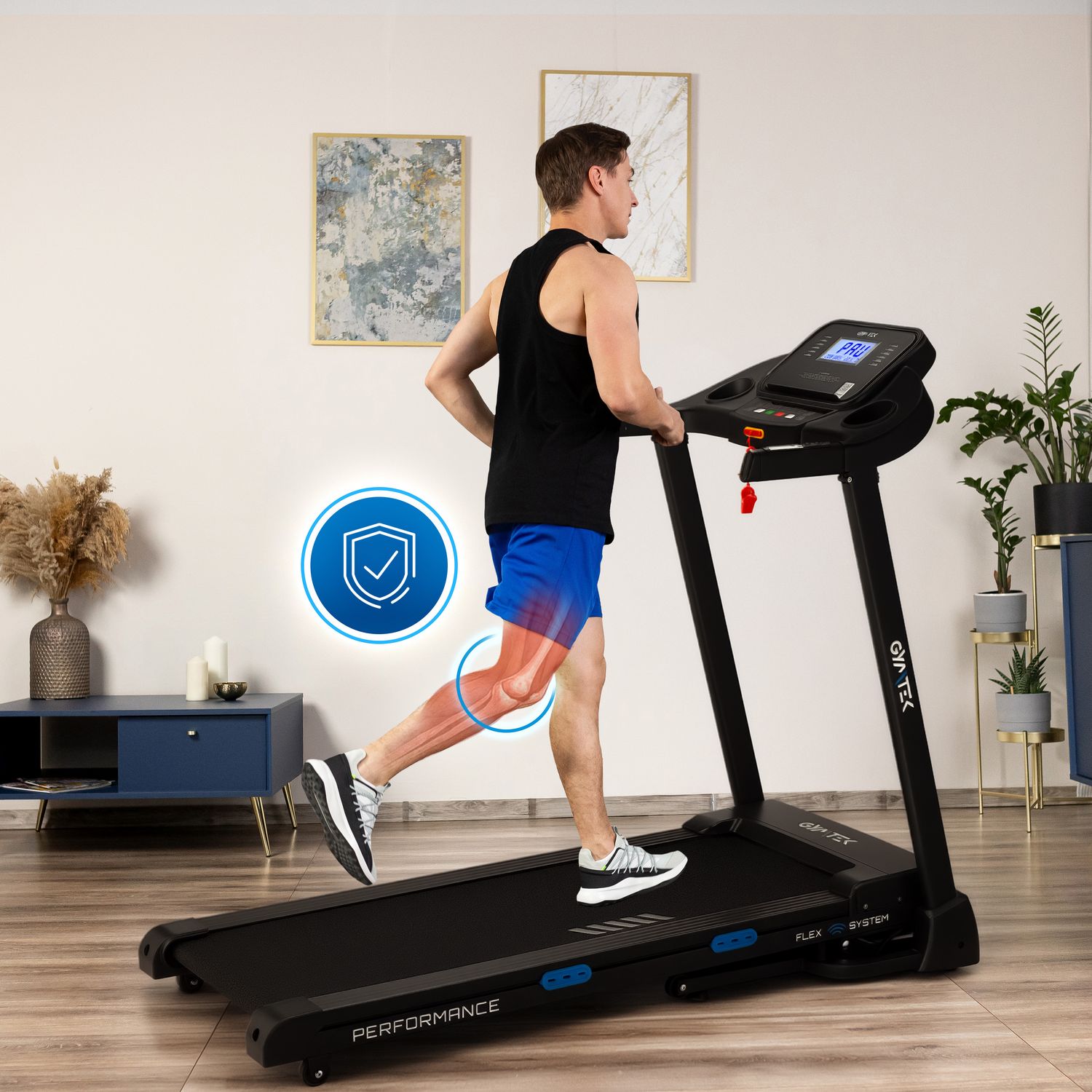 - Flex System: Amortyzacja oparta na 4 elastomerach skutecznie pochłania wstrząsy, chroniąc stawy i zwiększając komfort biegu.
