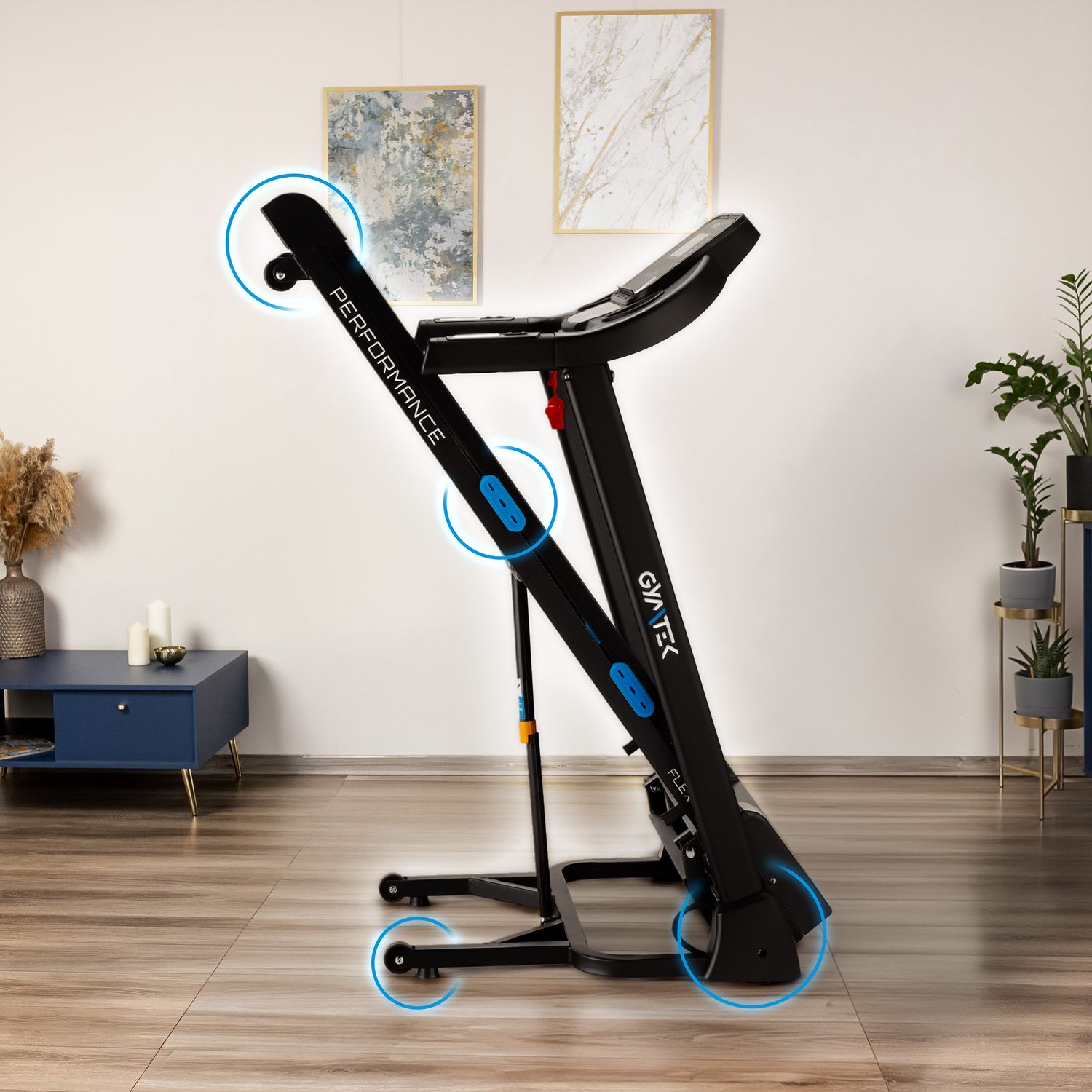 - Łatwe składanie: Siłownik hydrauliczny wspomaga ruchy mechaniczne, dzięki czemu złożenie bieżni nie wymaga użycia siły.