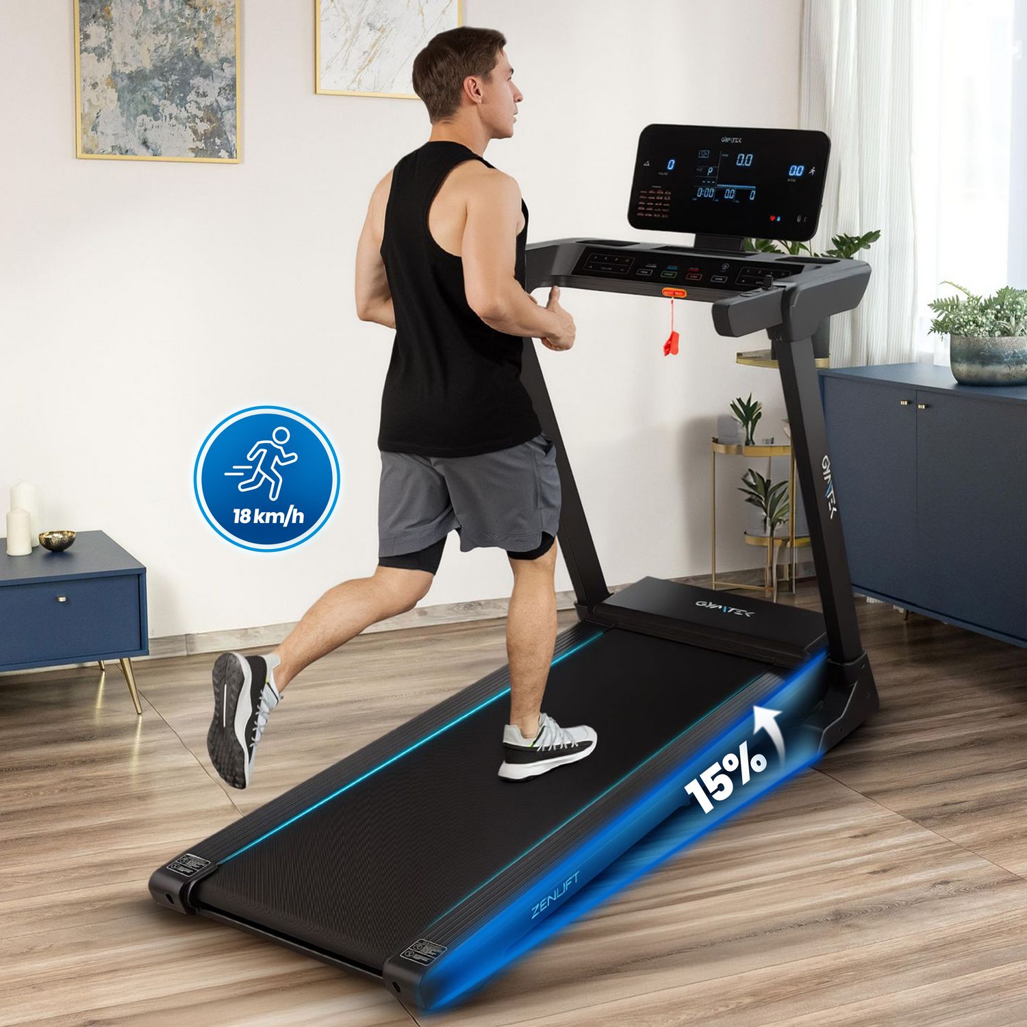 Zakres prędkości od 1 do 18 km/h oraz automatyczne nachylenie od 0 do 15% pozwalają na elastyczne dostosowanie poziomu trudności do każdego etapu aktywności – od rozgrzewki po symulację biegu pod górę. Dzięki możliwości szybkiej zmiany można błyskawicznie reagować na potrzeby swojego planu bez przerywania biegu.