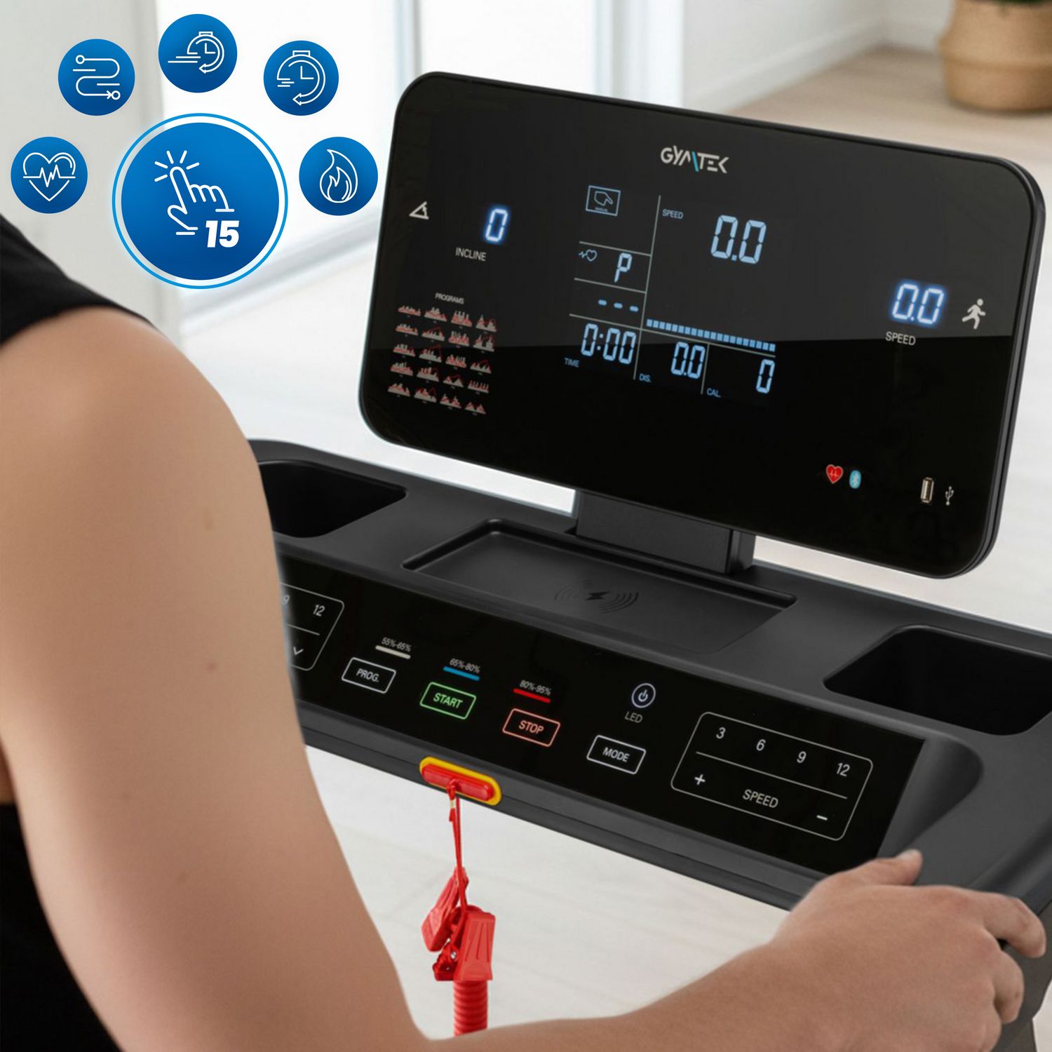 - Trening dopasowany do indywidualnych celów: Prędkość 1–18 km/h, automatyczne nachylenie 0–15% oraz przyciski szybkiej zmiany prędkości i nachylenia umożliwiają natychmiastowe dopasowanie trudności treningu – od marszu po intensywne biegi pod górę.