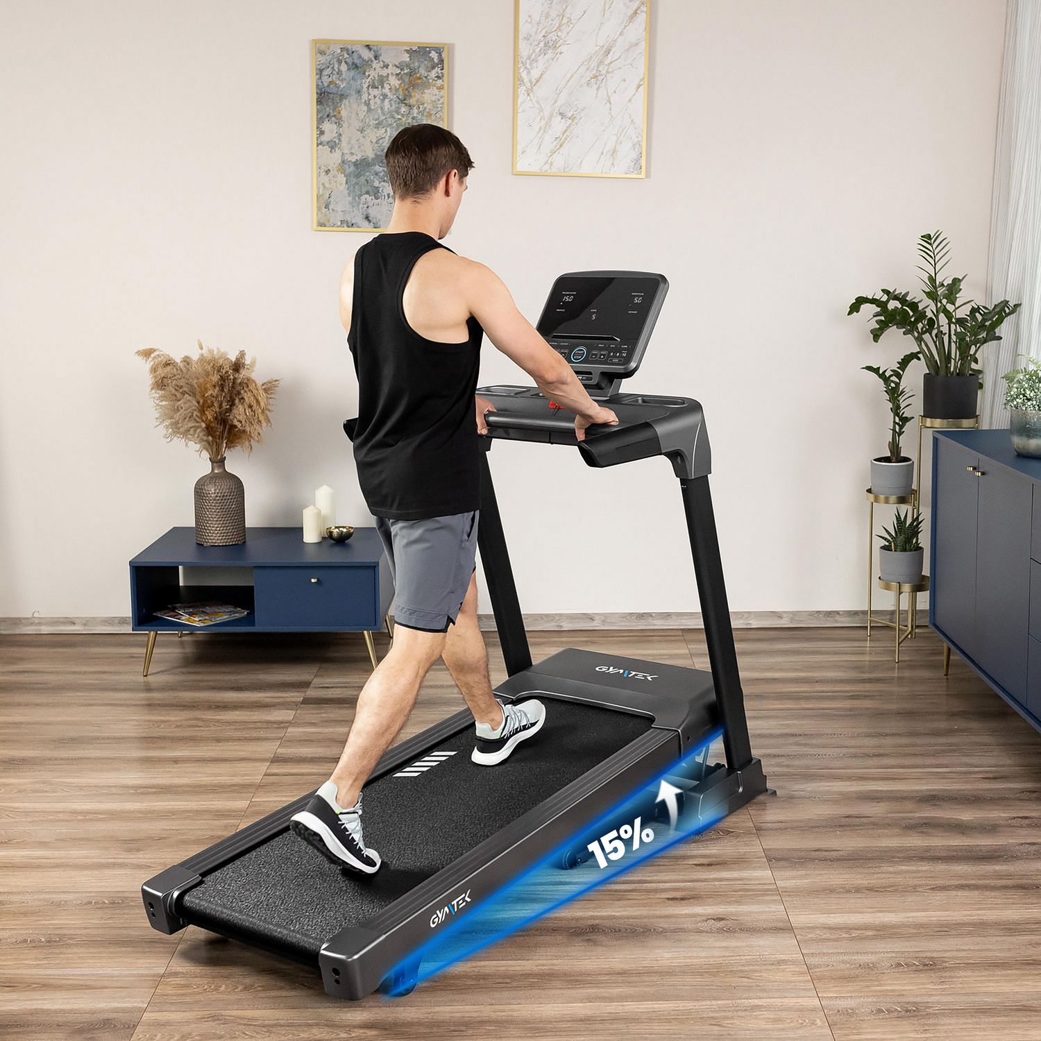 - Intensywny trening pod górkę: Regulacja nachylenia do 15% pozwala na realistyczne odwzorowanie biegu po wzniesieniach. Dzięki temu wzmacniasz mięśnie nóg, pośladków i poprawiasz wydolność organizmu.