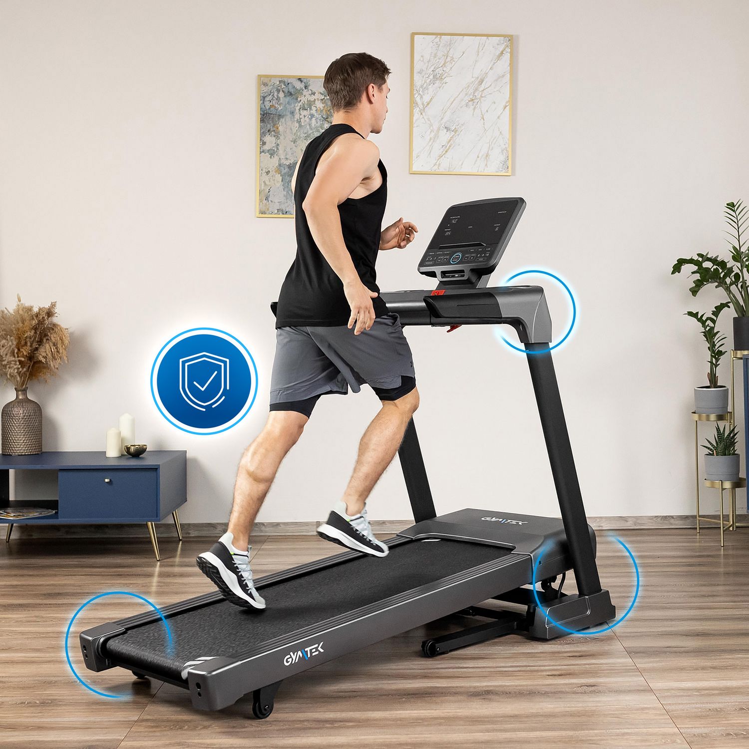 - Bezpieczne użytkowanie: Zredukowane wibracje zapewniają płynne działanie bieżni i sprawiają, że trening jest bardziej przyjazny dla całego układu ruchu.