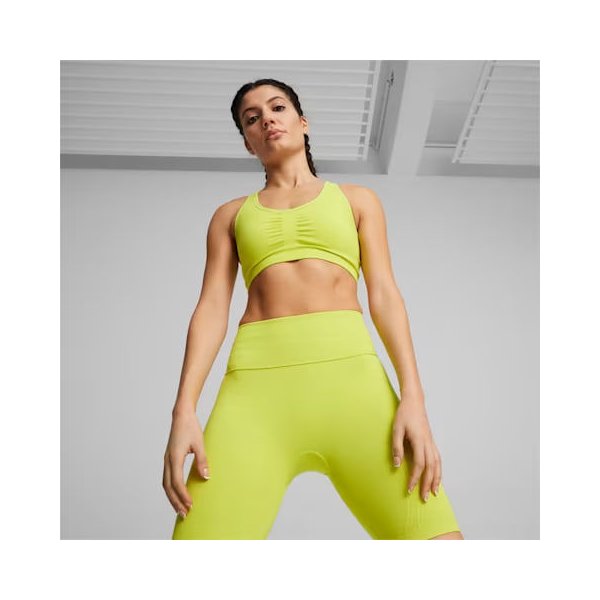 Biustonosz sportowy damski 4Keeps Shapeluxe Seamless Bra Puma zapewnia doskonałe wsparcie i wygodę podczas aktywności fizycznej. Dzięki włókna Lycra Adaptiv w bezszwowej konstrukcji, biustonosz doskonale dopasowuje się do sylwetki, zapewniając jednocześnie kompresję, która porusza się wraz z Tobą. Elastyczny materiał i bezszwowe wykończenia gwarantują wysoki komfort noszenia, a szerokie ramiączka krzyżujące się z tyłu zapewniają stabilność i maksymalną swobodę ruchów. Biustonosz posiada wyjmowane wkładki, dopasowany krój i logo marki Puma zarówno z przodu, jak i z tyłu.