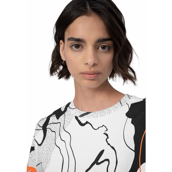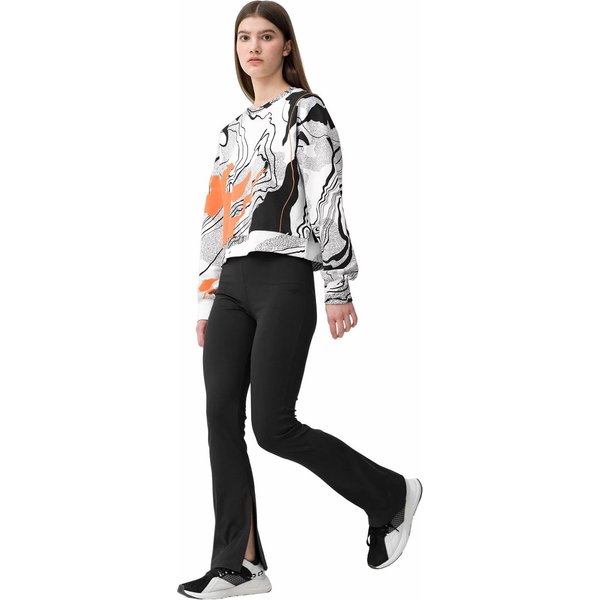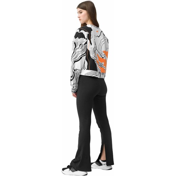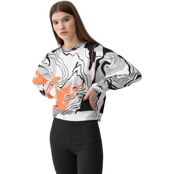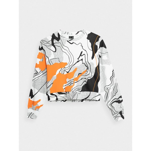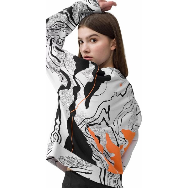 Bluza damska 4F to nieocieplona, nierozpinana bluza dresowa bez kaptura, wykonana z miękkiej bawełnianej dzianiny typu french terry. Bluza zapewni Ci wygodę dzięki szerszemu i skróconemu fasonowi oraz opuszczonym ramionom. Jej zaokrąglony dekolt ze ściągaczem oraz dół i mankiety zakończone elastycznym ściągaczem zapewnią Ci idealne dopasowanie. Kolorowy nadruk allover nadaje bluzie wyjątkowego charakteru, a prosty krój będzie pasował do wielu stylizacji. Bluza damska 4F to idealny wybór na co dzień, zapewniający komfort podczas codziennych aktywności.