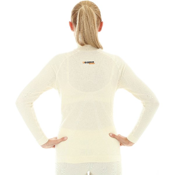 Wewnętrzna warstwa poliamidowa szybko odprowadza wilgoć od skóry, dzięki czemu skóra pozostaje sucha, nawet podczas intensywnego wysiłku. Struktura siatki w miejscach o wzmożonej potliwości (pod pachami) podnosi komfort użytkowania oraz wspomaga odprowadzanie wilgoci. W porównaniu ze zwykłą wełną, wełna merynosów nie "gryzie" jest miękka i przyjemna w dotyku. Strefy RIB wzdłuż linii talii i pod biustem zapewniają idealne dopasowanie do sylwetki i gwarantują swobodę ruchów. Bezuciskowe ściągacze przy nadgarstkach, szyi oraz na biodrach ograniczają ryzyko przedostawania się zimnego powietrza pod dzianinę. Dzianina antyalergiczna - nie powoduje uczuleń i podrażnień oraz bakteriostatyczna - nie wchłania brzydkich zapachów. Polecana do sportów zimowych lub aktywności w ekstremalnie niskich temperaturach.