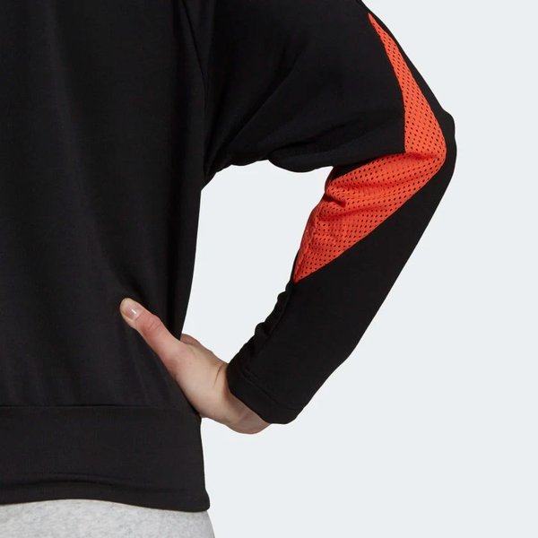Bluza zachwyca sportowym designem, który został podkreślony logotypem marki oraz kultowymi trzema paskami Adidas, które znajdują się na rękawach.