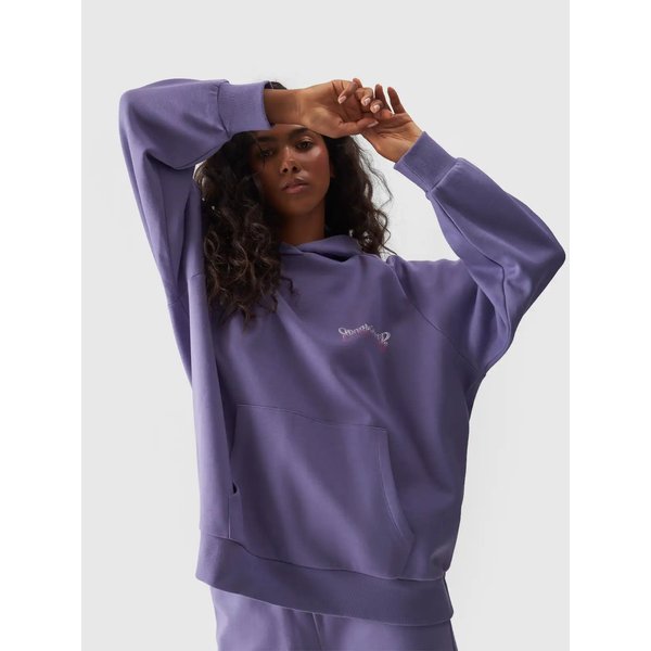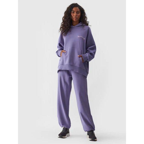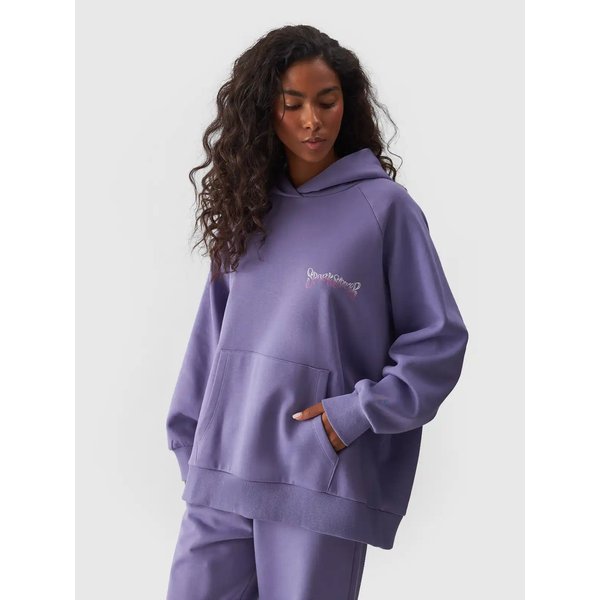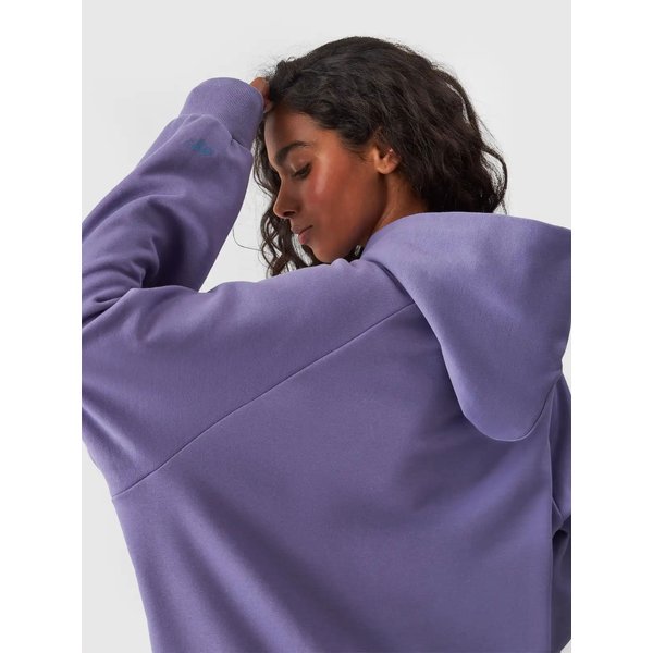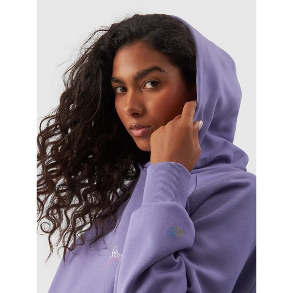 Damska bluza dresowa z kapturem marki 4F to idealne uzupełnienie zarówno codziennych, jak i sportowych stylizacji. Dzięki luźnemu krojowi, który swobodnie układa się na sylwetce, zapewnia maksymalny komfort i swobodę ruchów. Elastyczny splot single jersey sprawia, że bluza jest wyjątkowo miękka i wygodna w noszeniu. Praktyczna kieszeń typu kangurka dodaje funkcjonalności, a raglanowe rękawy oraz ściągacze przy rękawach i dole bluzy zapewniają doskonałe dopasowanie. Estetyczny napis na piersi oraz logo na rękawie dodają nowoczesnego akcentu, czyniąc bluzę stylowym elementem garderoby.