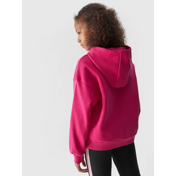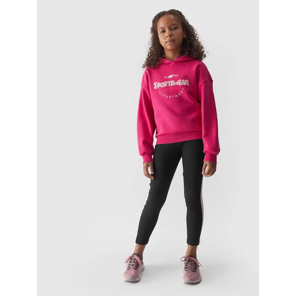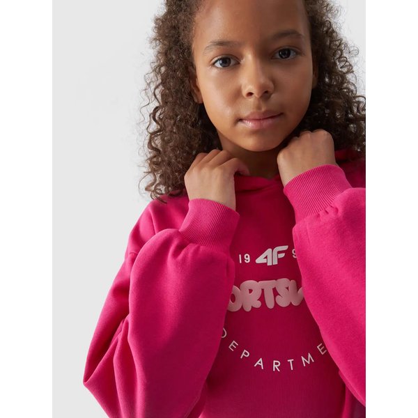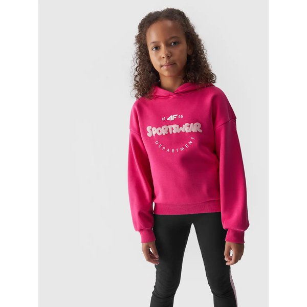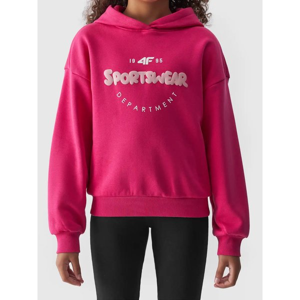 Bluza dziewczęca marki 4F to doskonały wybór dla aktywnych dziewcząt, które cenią sobie komfort i styl na co dzień. Dzięki krojowi regular, bluza wygodnie dopasowuje się do sylwetki, co zapewnia swobodę ruchów podczas różnych aktywności. Wykonana z elastycznego splotu single jersey, jest niezwykle komfortowa w noszeniu, a jednostronna gładka powierzchnia dodaje jej elegancji. Kaptur oraz napis "Sportswear" na przodzie nadają bluzie nowoczesny, sportowy wygląd. Ściągacze przy nadgarstkach i na dole bluzy zapewniają dodatkowe dopasowanie i wygodę, czyniąc ją idealnym elementem zarówno casualowych, jak i sportowych stylizacji.