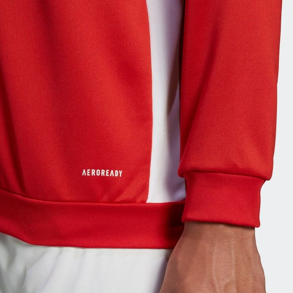 Gładka tkanina to wyjątkowy poliester w całości pozyskany z recyklingu. Materiał charakteryzuje się wysoką trwałością, więc bluza zachowa swój wygląd i jakość przez niejeden sezon. Dzięki technologii Aeroready wilgoć zostaje prędko odprowadzona, a skóra pozostaje komfortowo sucha i świeża. Zamek na 1/3 długości dodatkowo wspiera wentylację. Wkładana przez głowę wygodna bluza dopasowuje się do sylwetki dzięki ściągaczom przy mankietach i na dole. Nie ogranicza swobody ruchu i nie krępuje. Kaptur stanowi dodatkową ochronę przed chłodem i lekkim deszczem. Standardowy design sprawdzi się w każdej sportowej stylizacji. Aplikacje nawiązują do Ajax Amsterdam, co ucieszy kibiców tego holenderskiego klubu.