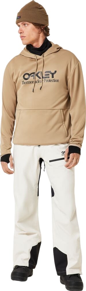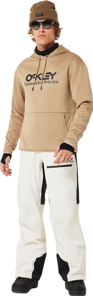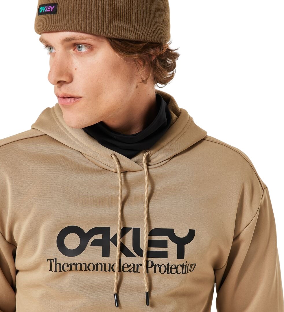 Jednym z kluczowych atutów tej bluzy jest jej przemyślany projekt, który łączy styl z praktycznością. Bluza jest wyposażona w kaptur z regulowanym ściągaczem, co umożliwia dostosowanie jego szerokości do indywidualnych potrzeb, zapewniając dodatkową ochronę przed wiatrem i chłodem. Na piersi znajduje się dynamiczny nadruk z logo Oakley Thermonuclear Protection, który dodaje bluzie sportowego wyrazu i jest symbolem jakości, z jaką marka jest kojarzona.