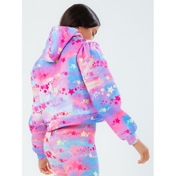Delikatna dzianina jest przyjemna w dotyku i delikatnie otula skórę i nie podrażnia jej. Bluza dopasowuje się do sylwetki dzięki ściągaczom przy mankietach, nie krępuje swobody ruchu. Kaptur stanowi dodatkową ochronę przed zimnem i lekkim deszczem. Skrócony model został w całości ozdobiony kolorowym wzorem oraz aplikacją z nazwą marki z przodu. Sprawdzi się w codziennych stylizacjach, idealnie pasuje do legginsów lub sportowych spódniczek.