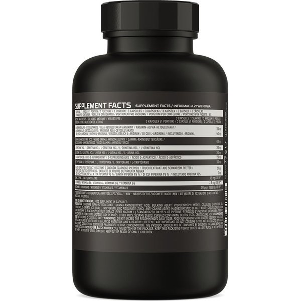 Alfa-ketoglutaran L-argininy, kwas gamma-aminomasłowy, substancja wypełniająca: hydroksypropylometyloceluloza, L-ornityna HCL, L-lizyna HCL, kwas D-asparaginowy (DAA), L- tryptofan, pikolinian cynku (cynk), substancja przeciwzbrylająca: sole magnezowe kwasów tłuszczowych; cholekalcyferol z lanoliny (witamina D), ekstrakt z owoców czarnego pieprzu (Piper nigrum L.) standaryzowany 95% piperyny, pirydoksalo 5’-fosforan (witamina B6).