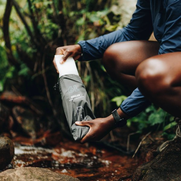 Bukłak Seeker+ 6L jest niezwykle wszechstronny. Posiada system Plun-N-Play, który umożliwia łatwe podłączenie do Camp Tap oraz zintegrowanego filtra. Dzięki filtrowi można usunąć z wody bakterie Escherichia coli, cysty Cryptosporidium parvum i Giardia Lamblia, co zapewnia bezpieczną wodę pitną gdziekolwiek się znajdujemy. Filtr Inline jest bardzo wydajny, potrafi przefiltrować około 1500 litrów wody z szybkością ponad 1 litr na minutę. Kolejnym atutem jest pojemność 6 litrów, co pozwala na zgromadzenie odpowiedniej ilości wody dla małej grupy osób. Miarka objętości umieszczona na boku bukłaka umożliwia dokładne kontrolowanie ilości zgromadzonej wody. Przegródki i spód 3D tworzą mocny i stabilny kształt, który ułatwia przenoszenie oraz zawieszanie pełnego bukłaka.