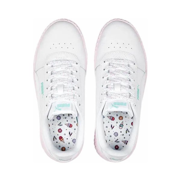 Buty Carina 2.0 Yummy Wm's Puma to rewelacyjne buty lifestyle dla kobiet. Te nawiązujące do lat 80. tenisówki zostały odświeżone dzięki słodkim kolorom i cukierkowym wzorom na wkładce. Buty zapewniają maksymalny komfort dzięki technologii SOFTFOAM+. Wkładka typu step-in zapewnia miękką amortyzację dzięki bardzo grubej pięcie. Cholewka buta wykonana jest w co najmniej 20% z materiałów pochodzących z recyklingu. To krok w kierunku lepszej przyszłości. Buty posiadają skórzaną cholewkę, gumową podeszwę środkową i zewnętrzną, PUMA Formstrip po stronie środkowej i bocznej oraz PUMA FOT na pięcie. To idealne buty dla kobiet ceniących sobie styl i wygodę.