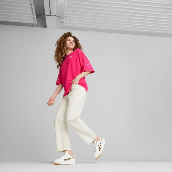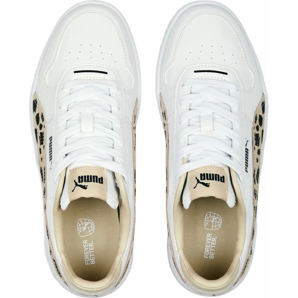 Sneakersy Carina Street Animal to idealny wybór dla kobiet, które cenią sobie styl i wygodę. Wkładka wewnętrzna SOFTFOAM+ zapewnia miękki komfort podczas chodzenia, dzięki bardzo grubej pięcie. Cholewa buta wykonana jest w co najmniej 20% z materiałów pochodzących z recyklingu, dlatego wybierając te buty, robisz krok ku lepszej przyszłości. Buty mają masywny profil i przyciągające wzrok akcenty w cętki, co sprawia, że są doskonałym wyborem do codziennych stylizacji. Paski PUMA Formstrip po bokach i w części środkowej oraz logo PUMA Cat na pięcie to dodatkowe elementy, które przyciągają uwagę.