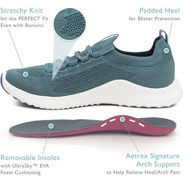Te lekkie buty lifestyle zapewniają nie tylko stylowy wygląd, ale przede wszystkim niezrównany komfort dzięki zastosowaniu innowacyjnego Systemu Ortopedycznego Aetrex. Najważniejszą cechą tych butów jest wbudowane wsparcie łuku, które pomaga stabilizować ciało, wyrównać stopy i złagodzić powszechne bóle stóp, takie jak np. plantar fasciitis czy ból pięty. Dodatkowo wkładka z amortyzacją UltraSky zapewnia ulgę w nacisku i komfort na każdym kroku. Mikrofibra wyłożona antybakteryjną technologią sprzyja utrzymaniu higieny stóp, eliminując nieprzyjemne zapachy. Buty Carly Wm's Aetrex wykonane są z elastycznej dzianiny, co zapewnia idealne dopasowanie do stopy i swobodę ruchów. Lekka podeszwa środkowa UltraSky oraz gumowe elementy na zewnętrznej części podeszwy gwarantują trwałość i amortyzację.