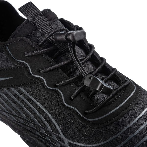 - Stabilność podczas aktywności: Elastyczny ściągacz oplata stopę i współdziała z bocznymi elementami wzmacniającymi, co ogranicza przesuwanie się buta podczas biegania, pływania czy chodzenia po kamienistym podłożu.