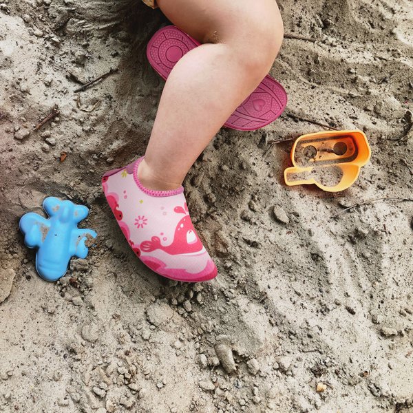 Buty chronią stopy dziecka przed ostrymi kamieniami, gorącym piaskiem czy śliskimi nawierzchniami, zapewniając ochronę podczas wakacyjnych aktywności. Dzięki odpowiednio zaprojektowanej podeszwie i zabudowanej konstrukcji użytkownik może swobodnie bawić się zarówno w wodzie, jak i na suchym podłożu.