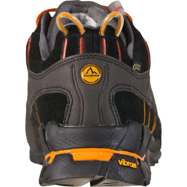 W modelu Hyper GTX od marki La Sportiva zabezpieczono czubek buta. To miejsce jest jednym z najbardziej narażonych na ścieranie podczas użytkowania, zatem zdecydowano pokryć go gumą, która ochroni go przed szybkim zniszczeniem.