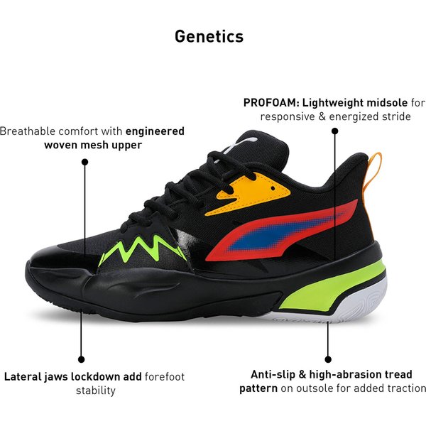 Buty koszykarskie Genetics Puma to idealny wybór dla aktywnych graczy. Dzięki lekkiej podeszwie ProFoam z EVA zapewniają doskonałą amortyzację i komfort podczas gry. Cholewka z zaawansowanej technologicznie siateczki zapewnia cyrkulację powietrza, a boczne wsparcie stabilizuje stopę podczas szybkich zmian kierunku. Gumowa podeszwa zewnętrzna o wysokiej odporności na ścieralność gwarantuje przyczepność na boisku. Wygodne sznurowanie oraz pętelka na pięcie ułatwiają zakładanie i dopasowanie butów. Buty Puma Genetics to połączenie funkcjonalności i sportowego designu.