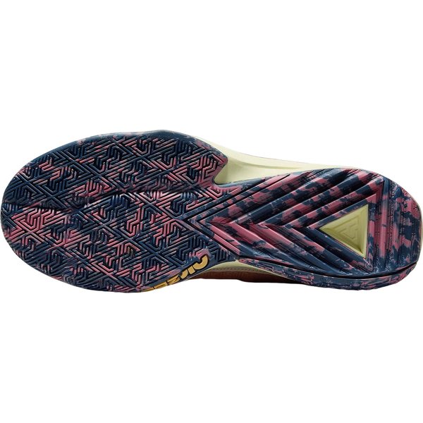 Wzór geometryczny na bocznych panelach oraz logo na języku i pięcie nadają butom charakterystyczny wygląd, który przyciąga wzrok zarówno na parkiecie, jak i poza nim. Teksturowana podeszwa środkowa oraz zewnętrzna z bieżnikiem zapewniają doskonałą przyczepność, co jest kluczowe dla zachowania równowagi i stabilności podczas dynamicznych ruchów. Wzmocnienie na palcach dodatkowo chroni przed uszkodzeniami, co czyni buty jeszcze bardziej trwałymi. Wkładka wewnętrzna dodaje elegancji i podkreśla markę, która od lat jest synonimem jakości i innowacji w świecie sportu. Wielokolorowa podeszwa zewnętrzna nie tylko prezentuje się stylowo, ale również zwiększa widoczność i bezpieczeństwo podczas gry. Buty te umożliwiają graczom realizowanie imponujących akcji o zawrotnej szybkości, które mogą rozstrzygnąć wyniki meczu.