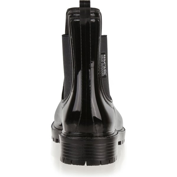 Buty Lady Harriett II Wm's Regatta to stylowe i wygodne botki dla kobiet. Są one doskonałym wyborem dla osób, które chcą wyglądać modnie na świeżym powietrzu. Wykonane są z wodoodpornej i wytrzymałej gumy, co gwarantuje długotrwałe użytkowanie. Mają wysokość za kostkę, elastyczne wstawki boczne oraz pętlę na pięcie, co ułatwia zakładanie i zdejmowanie butów. Grubsza podeszwa zapewnia stabilność i wygodę podczas chodzenia. Dodatkowo, połyskująca powierzchnia nadaje im elegancji.
