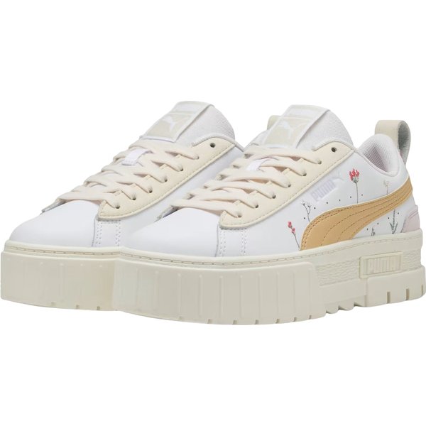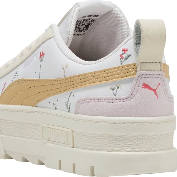 Buty Mayze Secret Garden Wm's Puma to idealne połączenie stylu i komfortu, które przyciągnie uwagę każdej miłośniczki mody. Dzięki niskoprofilowej konstrukcji i skórzanej cholewce z wzorami, te sneakersy oferują niezwykłą wygodę i unikalny, artystyczny wygląd. Gruba, żłobiona podeszwa zapewnia pewność każdego kroku, a wzmocniony zapiętek z pętelką dodaje stabilności. Sznurowanie umożliwia idealne dopasowanie do stopy, a boczne i tłoczone logo podkreśla markowy charakter obuwia. Tekstylna wyściółka i wkładka z nadrukiem dbają o komfort noszenia przez cały dzień, czyniąc te buty doskonałym wyborem.