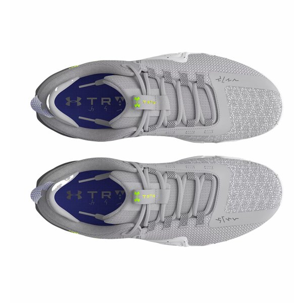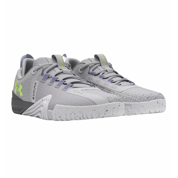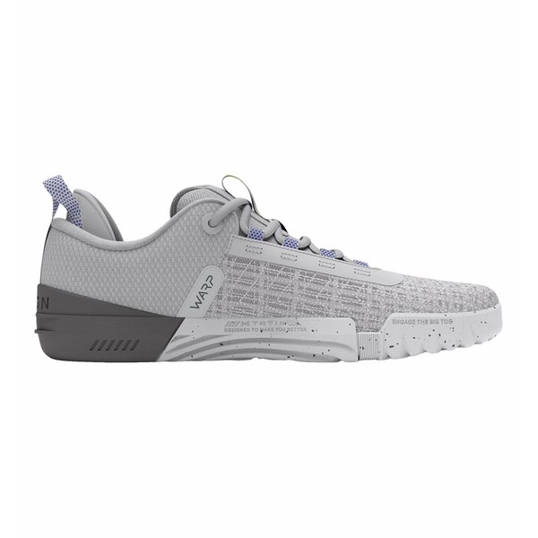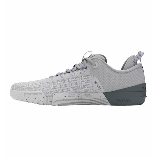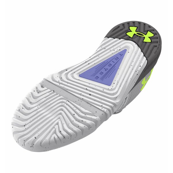 Podeszwa środkowa, zaprojektowana z myślą o różnorodnych potrzebach sportowców, oferuje podwójną gęstość. Jest bardziej miękka w przedniej części stopy, co zwiększa komfort, a jednocześnie mocniejsza w obszarze pięty, co zapewnia stabilność i wsparcie podczas podnoszenia ciężarów. Taka kombinacja pozwala na pełne skoncentrowanie się na treningu bez konieczności martwienia się o komfort i wsparcie stóp. Technologia UA TriBase w podeszwie maksymalizuje kontakt z podłożem, co wspomaga naturalny ruch stopy i zapewnia elastyczność oraz przyczepność podczas podnoszenia. To pozwala na lepsze wyczucie podłoża i przekazywanie mocy, co jest kluczowe podczas intensywnych ćwiczeń siłowych i dynamicznych ruchów. Podeszwa zewnętrzna z pełnej gumy otacza boki buta, co zapewnia dodatkową trwałość i odporność na ścieranie. Odpowiednia przyczepność, zwłaszcza w obszarze środkowym, jest kluczowa w przypadku treningów z liną, co czyni te buty idealnym wyborem na różnorodne aktywności. Dla lepszej przyczepności, buty zostały wyposażone w strategicznie rozmieszczoną gumową konstrukcję pod palcami. To rozwiązanie pozwala na pewniejszy krok, zwłaszcza podczas dynamicznych zmian kierunku.