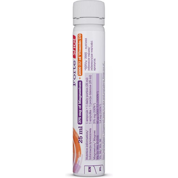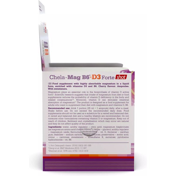 Chela-Mag B6® + D3 Forte Shot to suplement diety zawierający wysoko przyswajalną płynną formę magnezu w postaci chelatu aminokwasowego wzbogaconego witaminą D3 i witaminą B6. Magnez jest pierwiastkiem niezbędnym w biosyntezie aktywnej formy witaminy D. Badania naukowe sugerują, iż spożycie magnezu z diety lub suplementów zmniejsza prawdopodobieństwo niewystarczającego poziomu witaminy D w organizmie i następstw z tym związanych.