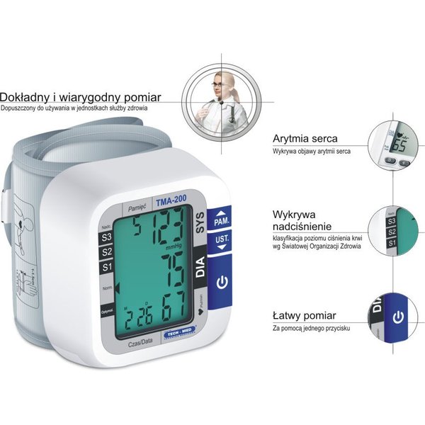 TMA 200 jest to całkowicie zautomatyzowany aparat do pomiaru ciśnienia krwi i tętna zakładany na nadgarstek. Aparat jest prosty w użyciu i doskonale nadaje się do wykonywania codziennych pomiarów. Duży wyświetlacz ułatwia odczyt ciśnienia skurczowego, rozkurczowego oraz tętna po zakończeniu każdego pomiaru. Poziom ciśnienia powietrza w mankiecie jest programowany automatycznie, zgodnie z indywidualnym ciśnieniem skurczowym (systolicznym) pacjenta. Ponadto wbudowana pamięć umożliwia przechowywanie maksymalnie 60 ostatnich wyników pomiarów co jest bardzo wygodne dla użytkownika, który chce regularnie kontrolować i obserwować swoje ciśnienie. Ciśnieniomierz nadgarstkowy TMA 200 jest mały i łatwy do przenoszenia co sprawia, że doskonale nadaje się do stosowania w domu i w podróży. Pomiary ciśnienia wykonywane tym aparatem są równorzędne z pomiarami wykonywanymi przez wykwalifikowanych pracowników służby zdrowia z użyciem tradycyjnego mankietu i stetoskopu metodą osłuchową. Pod warunkiem dokonywania pomiaru w odpowiedniej pozycji ciała i ręki. Ciśnieniomierz TMA 200 jest chroniony programem gwarancyjnym obejmującym wady produkcyjne. Funkcja automatycznego wyłączania zmniejsza zużycie baterii.
