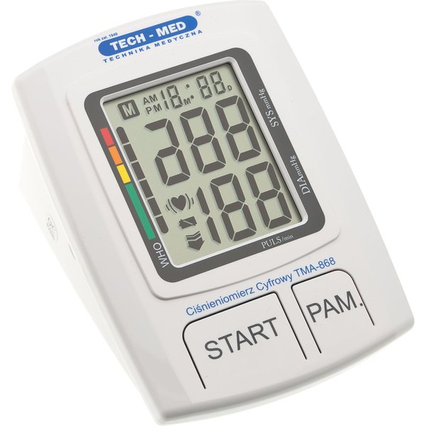 TECH-MED TMA-868 to nowoczesny ciśnieniomierz elektroniczny, w którym zastosowano oscylometryczną metodę pomiaru z zastosowaniem technologii FUZZY LOGIC. Ciśnieniomierz charakteryzuje się wysoką dokładnością pomiaru - równorzędną dokładności pomiarów dokonywanych metodą osłuchową za pomocą sphygmomanometrów mechanicznych przez wykwalifikowany personel medyczny. Dokładność ta została potwierdzona badaniami klinicznymi. Wykonanie dokładnego pomiaru ciśnienia jest niezwykle proste - wymaga przyciśnięcia tylko jednego przycisku. Ergonomiczny wyświetlacz LCD zapewnia łatwy odczyt wyniku pomiaru