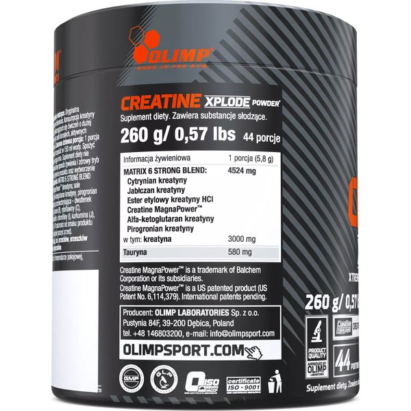 Doskonała kompozycja najbardziej zaawansowanych form kreatyny, charakteryzujących się najwyższą aktywnością anaboliczną i wzorem przemian energetycznych. Creatine Xplode™ to zestawienie w jednym, unikatowym, produkcie aż 6 najpopularniejszych i najbardziej skutecznych form kreatyn, stosowanych obecnie na świecie w zaawansowanej suplementacji sportowców. Skład tego szczególnego produktu został odpowiednio wyważony, tak, aby uwalnianie swobodnych cząsteczek kreatyny było największe zaraz po spożyciu Creatine Xplode™ bardzo szybko pokrywając zapotrzebowanie organizmu na ten związek, w stanach jego największego narażenia na katabolizm, czyli po przebudzeniu i zaraz po treningu. W skład tego skutecznego produktu wchodzą takie formy kreatyny jak jabłczan, ester etylowy, alfa-ketoglutaran, pirogronian, cytrynian oraz prawdziwa "perełka" w tej grupie - doskonały chelat kreatynowy magnezu (Creatine Magna Power). Użycie tych wysokowydajnych form kreatyn gwarantuje osiągnięcie nie tylko, wspomnianej już, maksymalnie zróżnicowanej kinetyki uwalniania wolnej cząsteczki kreatyny, a także minimalnych strat tej substancji (przemiana do nieaktywnej kreatyniny) w niesprzyjających warunkach środowiska przewodu pokarmowego. Nie bez znaczenia pozostaje fakt, iż użyte metabolity energetyczne kreatyny (pirogronian, jabłczan czy alfa-ketoglutaran), po uwolnieniu jej wolnej cząsteczki, zasilają pulę związków wchodzących w cykl przemian energetycznych organizmu (m.in. cykl Krebsa), bezpośrednio wpływając na obniżenie subiektywnego uczucia zmęczenia sportowca. Bardzo skutecznie pomaga w tym również wzbogacenie Creatine Xplode™ o taurynę, która działając synergistycznie potrafi bardzo efektywnie wpłynąć na zwiększenie objętości treningu, wyraźnie przyczyniając się do poprawy osiągów sportowych, skracając jednocześnie czas regeneracji potreningowej. Wszystkie przytoczone fakty bezsprzecznie stawiają najnowszy produkt OLIMP na pozycji lidera w porównaniu z tradycyjnymi, jednoskładnikowymi suplementami kreatyny.