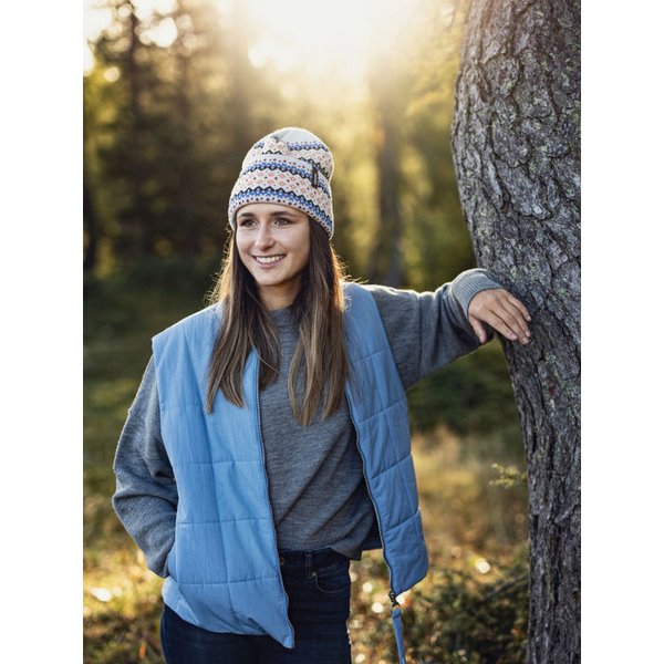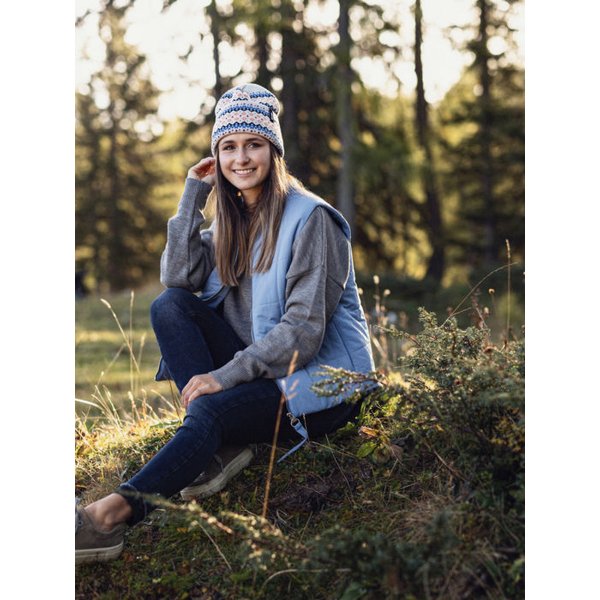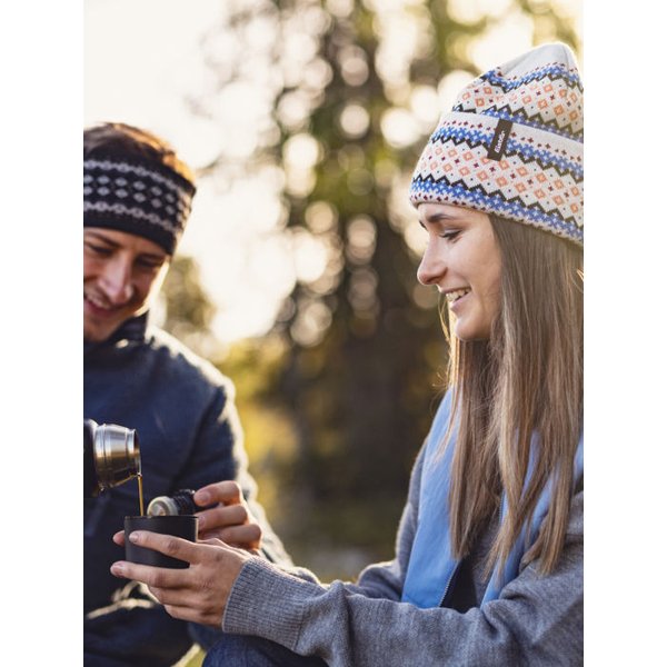 Czapka zimowa od marki Eisbar to doskonały wybór dla osób ceniących sobie komfort i zrównoważony rozwój. Dzięki zaawansowanej mieszance materiałów Rewoolive, czapka łączy w sobie aż 55% wełny merino oraz 45% poliestru z recyklingu, co zapewnia wyjątkową izolację termiczną i skuteczne odprowadzanie wilgoci. Naturalne włókna merino charakteryzują się wysoką oddychalnością oraz szybkim schnięciem, co sprawia, że czapka doskonale sprawdzi się nawet w najbardziej wymagających warunkach pogodowych. Nowoczesna, dzianinowa struktura z geometrycznymi wzorami i wywiniętym brzegiem nadaje całości unikalnego, outdoorowego charakteru, a metka z boku subtelnie podkreśla jej markę. Czapka została wyróżniona znakiem zrównoważonego rozwoju Blue Bear, co świadczy o jej przyjazności dla środowiska.