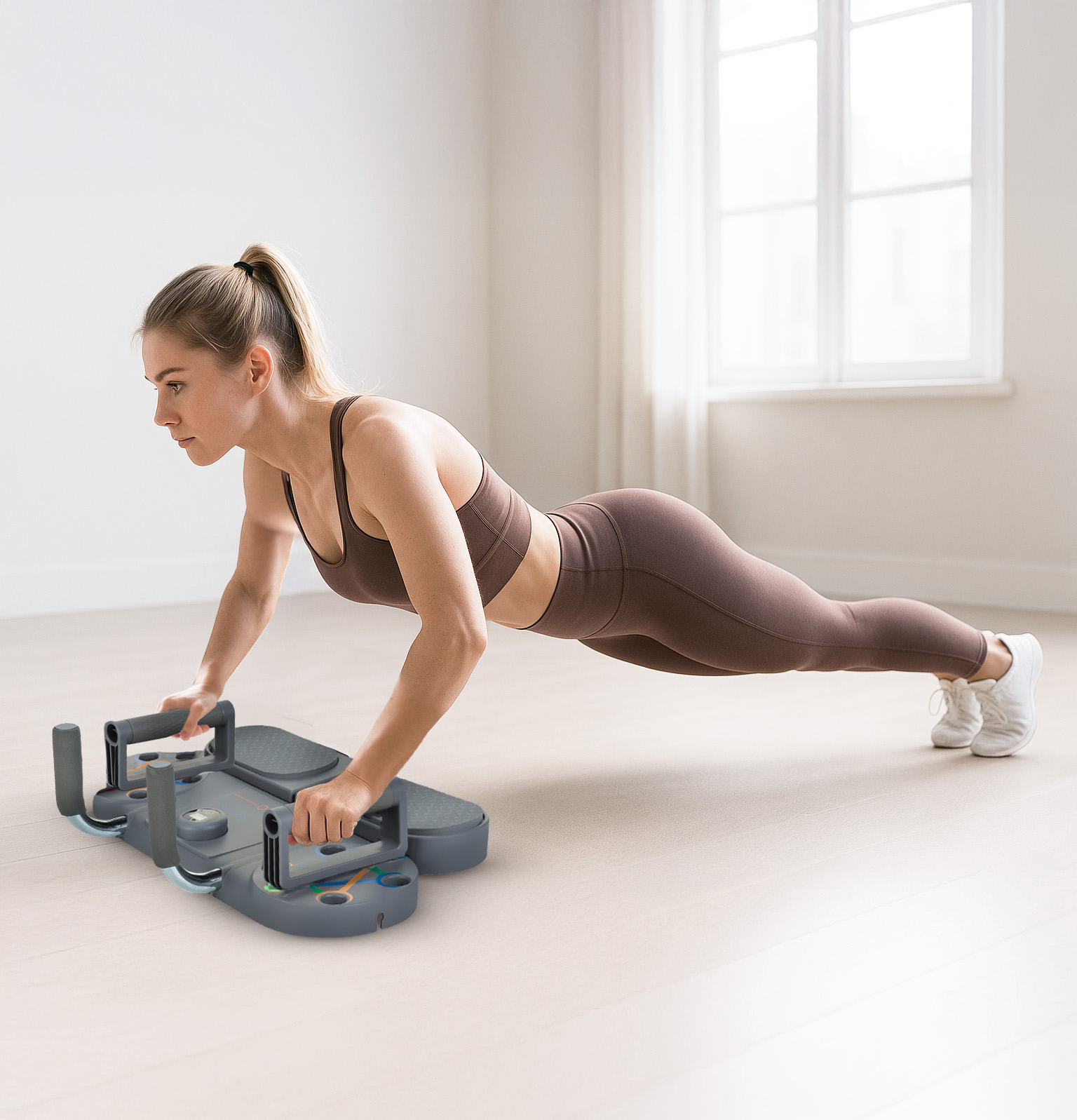 Deska do pompek Multi to wszechstronne narzędzie, które dzięki różnorodnemu ustawieniu uchwytów pozwala aktywować różne grupy mięśniowe, umożliwiając kompleksowy trening całego ciała. System FlexFit zapewnia szybkie dopasowanie uchwytów, co ułatwia skoncentrowanie się na konkretnych partiach mięśni. Antypoślizgowa powierzchnia zwiększa stabilność podczas ćwiczeń, ograniczając przesuwanie się sprzętu. Wbudowany licznik czasu wspiera regularność treningów i monitorowanie postępów. Kompaktowa konstrukcja ułatwia przechowywanie i transport, dzięki czemu deska sprawdzi się zarówno w domu, jak i na świeżym powietrzu.