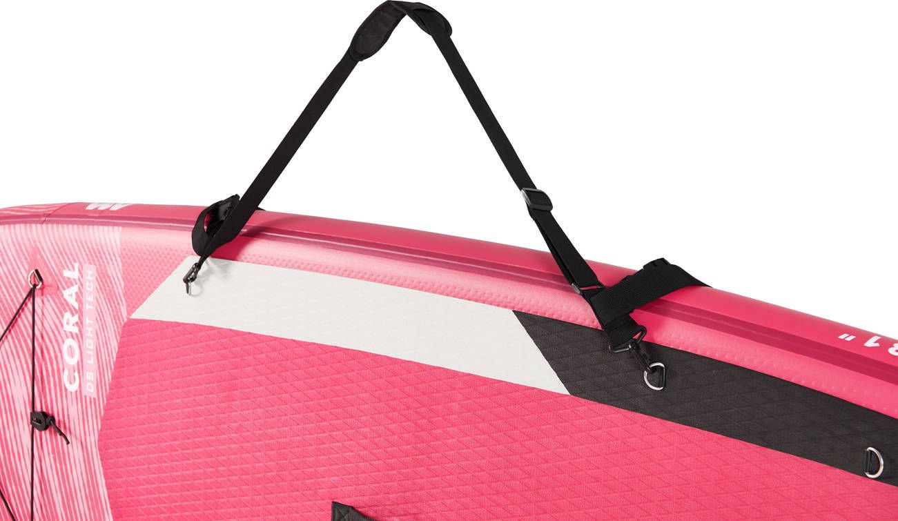 Ciekawy design sprawi, że od razu zostaniesz dostrzeżona z daleka i poczujesz się wyjątkowo korzystając z niej. Możesz mieć pewność, że nikt nie przejdzie obok Ciebie obojętnie! Logo marki podkreśli wysoką jakość produktu, dzięki której poczujesz pełnię satysfakcji z posiadania tego modelu. Deska posiada wytrzymałe uchwyty do transportu. Przeniesiesz ją tam, gdzie tylko zechcesz bez jakiegokolwiek problemu, więc niczym nie będziesz musiała się martwić. Dodatkowo, znajdziesz tam także uchwyty bagażowe i linkę bezpieczeństwa.
