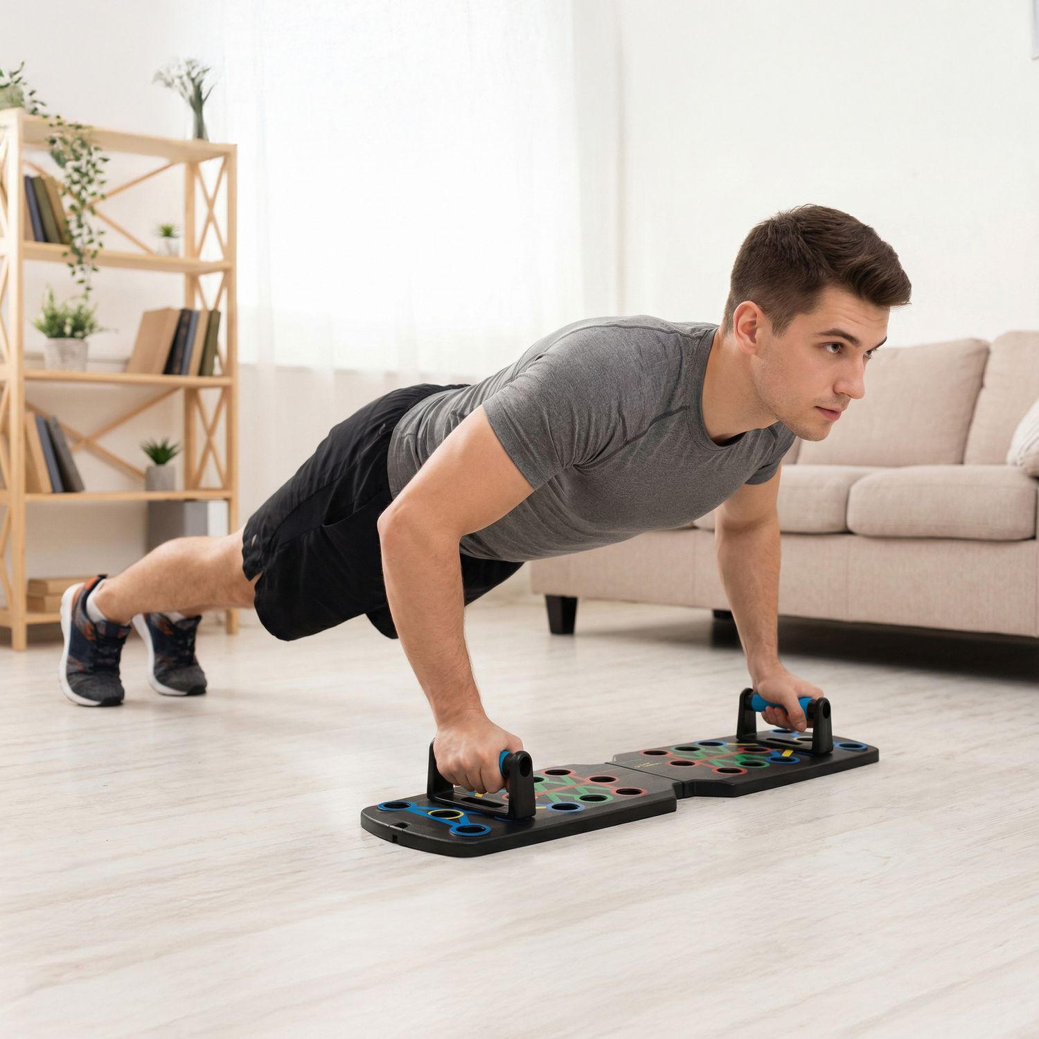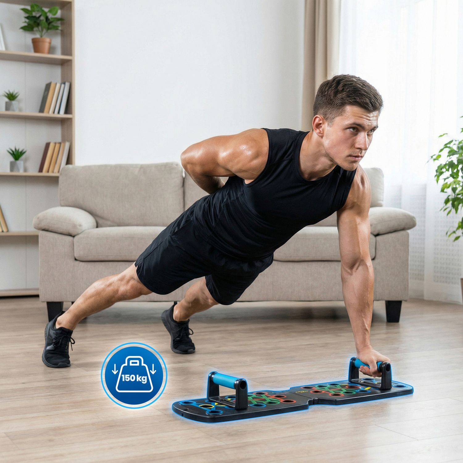 - 2 ergonomiczne podpórki: Uchwyt z antypoślizgową powłoką zapewnia stabilność dłoni podczas ćwiczeń, zmniejszając nacisk na nadgarstki i zwiększając komfort oraz bezpieczeństwo treningu.
