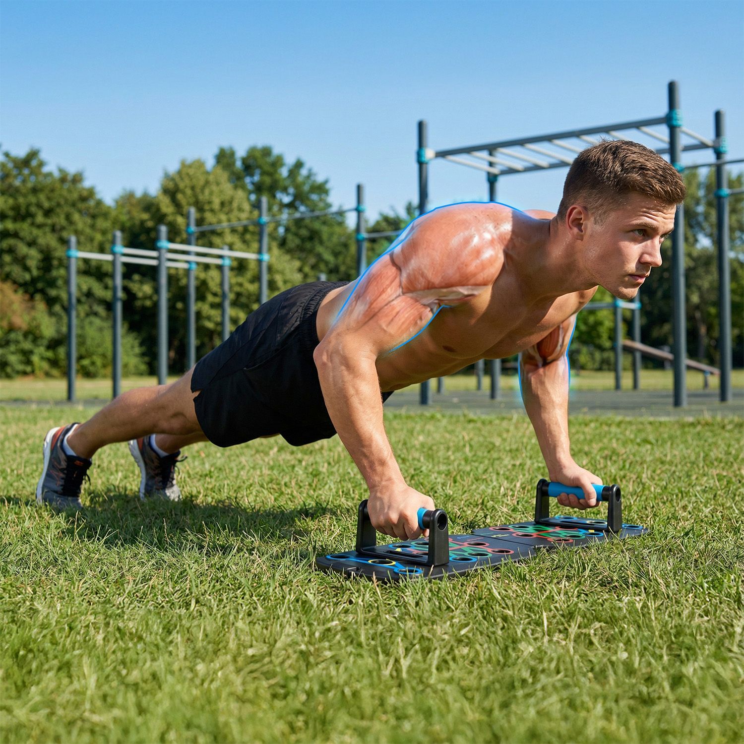 Deska do pompek Gymtek to wszechstronne narzędzie treningowe, które dzięki różnym ustawieniom uchwytów angażuje klatkę piersiową, plecy, barki i tricepsy, wspierając kompleksowy rozwój sylwetki. Jej kompaktowa i składana forma sprawia, że łatwo ją przechowywać i zabrać ze sobą wszędzie – sprawdzi się zarówno w domu, jak i na siłowni czy podczas treningu na świeżym powietrzu. Solidna konstrukcja i antypoślizgowe podkładki gwarantują stabilność oraz komfort użytkowania, nawet przy intensywnym obciążeniu. To idealne rozwiązanie dla osób, które cenią efektywność i mobilność w codziennym treningu.