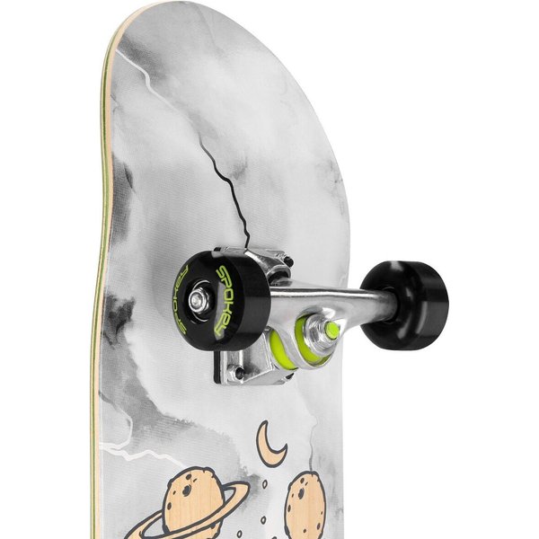Elastyczny blat mierzy prawie 80 centymetrów długości i 20 centymetrów szerokości. Siedmiowarstwowa konstrukcja z klonu kanadyjskiego i chińskiego jest niesamowicie solidna, co przekłada się na trwały model, który będzie sprawdzał się przez długi czas. Antypoślizgowa nawierzchnia black grip tape poprawia komfort i bezpieczeństwo użytkowania. Utrzymanie stabilnej pozycji i pewności na desce pomaga w nauce i wykonywanie nowych trików. Wyprofilowany kształt ułatwia manewrowanie. Koła o twardości 92A i łożyska ABEC7 pochłaniają wstrząsy i amortyzują przez co Skalle idealnie sprawdza się na miejskich, nierównych nawierzchniach. Ponadto kółka są odporne na ścieranie, co pozwala przez długi czas utrzymać estetyczny wygląd deski. Model spełnia normę EN 13613, jest bezpieczny dla użytkowników na każdym poziomie zawansowania.