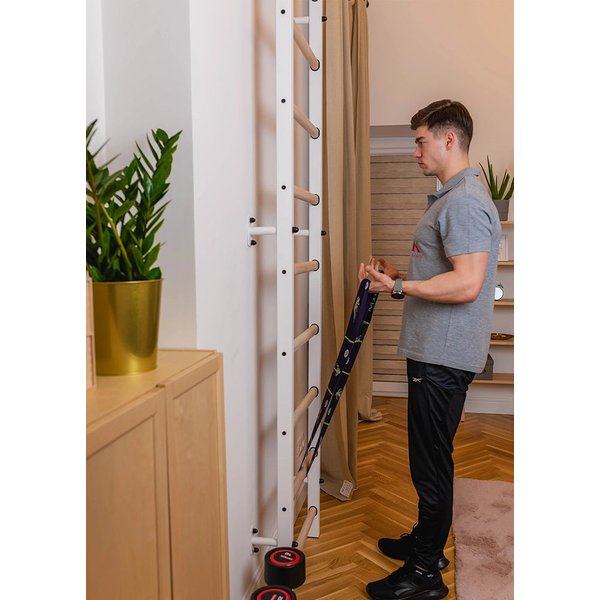 Konstrukcja drabinki wykonana jest z najwyższej jakości materiałów. Metalowe profile malowane proszkowo oraz drewniane szczeble z drewna bukowego, olejowane organicznym olejem na bazie lnu, zapewniają trwałość i wyjątkową estetykę. Precyzyjnie wykonane cięcia i otwory sprawiają, że drabinka nie tylko wygląda perfekcyjnie, ale jest również niezwykle bezpieczna i stabilna. Spełniając europejskie normy dla profesjonalnego sprzętu gimnastycznego, gwarantuje niezawodność przez długie lata. Instalacja drabinki jest prosta i intuicyjna. Montaż do ściany pozwala na pewne i stabilne umiejscowienie urządzenia, a dołączony zestaw montażowy ułatwia ten proces. Dzięki możliwości dostosowania drabinki do różnych typów ścian, jest ona odpowiednia do większości pomieszczeń. Warto jednak zwrócić uwagę na minimalną wysokość pomieszczenia, która powinna wynosić przynajmniej 250 cm, co gwarantuje komfort użytkowania i pełne wykorzystanie potencjału drabinki.