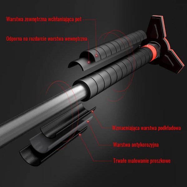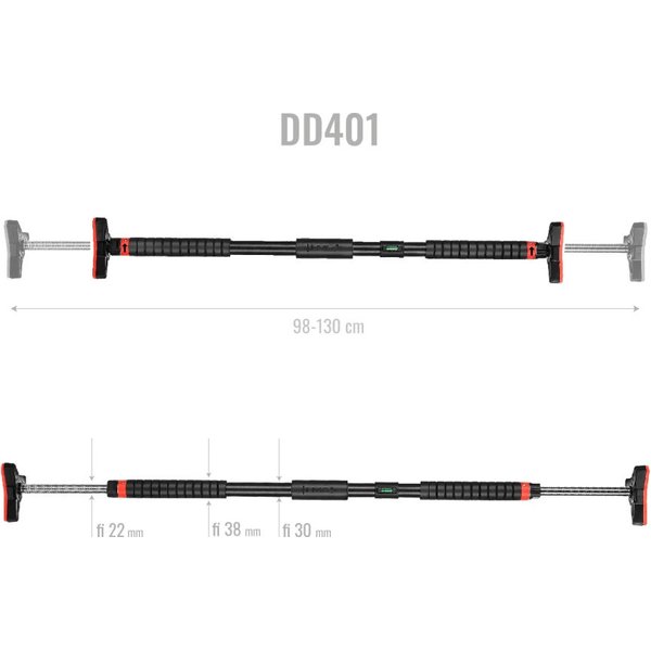Drążek jest wyposażony w poziomicę, dzięki czemu montaż jest jeszcze pewniejszy, a trening jeszcze bezpieczniejszy. Uchwyty na końcach drążka są pokryte specjalnym materiałem, który wchłania pot i zabezpiecza przed ślizganiem się dłoni. Dodatkowo, produkt jest odporny na zarysowania dzięki warstwie podkładowej, antykorozyjnej i trwałemu proszkowemu malowaniu. Drążek rozporowy DD401 umożliwia wykonanie wielu różnych ćwiczeń, takich jak podciąganie, podchwytywanie, dipsy czy pompki, co pozwala na zróżnicowanie treningu i osiągnięcie pożądanych efektów. Dzięki niemu zwiększysz swoją siłę, wytrzymałość oraz poprawisz ogólną kondycję fizyczną.